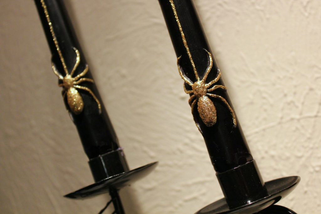 We found a cool cobweb-covered candelabra with some tapered candles, complete with gold spiders.