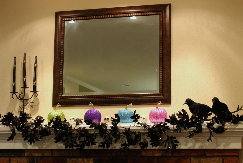 My fireplace mantle is in a little bit of a dim spot, so it has the perfect ambiance for Halloween decorations. We have overhead lights that shine down, so the pumpkins really sparkle.