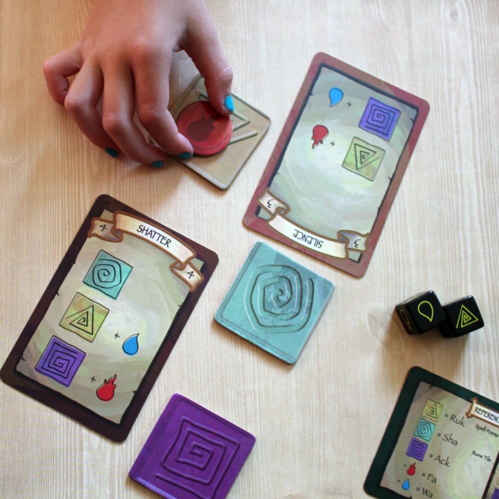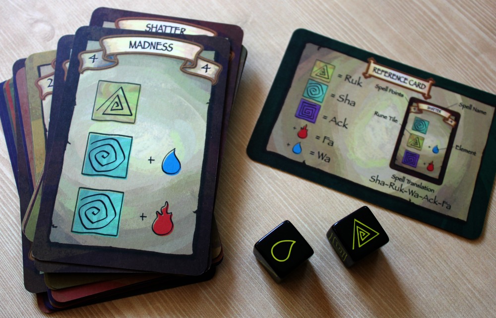To start, you leave the Runes and Tiles pieces in the box, and each player receives two spell cards. You choose one out of the two (discarding the other), and it’s time to roll the dice. The goal is to complete your spell as fast as possible to earn points.