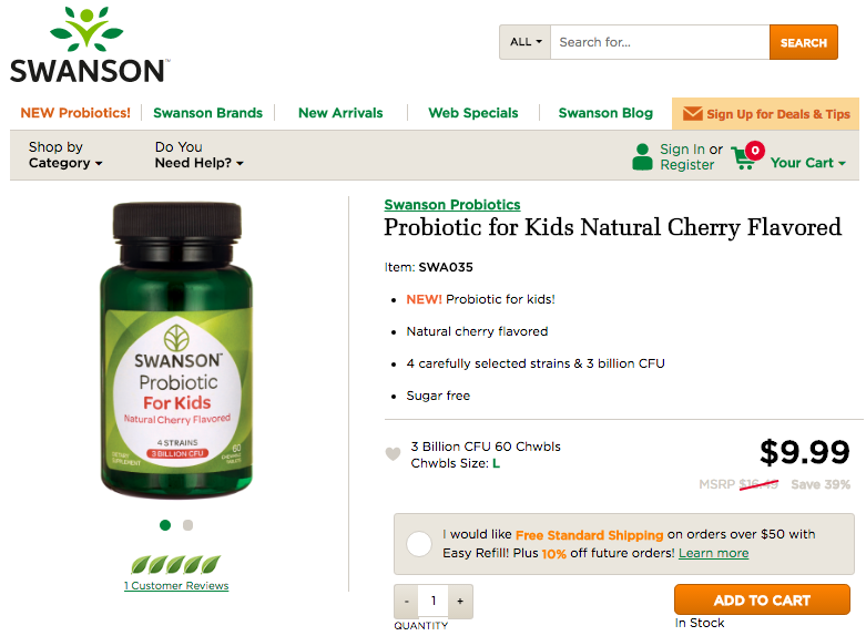 The Swanson website is very organized, and you can either type in a search, or browse through many categories. Â I had no problem finding a selection of probiotic products both under “Probiotics” and “Children’s health” (or you can find by using the search feature). Â My kids love their new tasty probiotics, which I added to their daily routine.