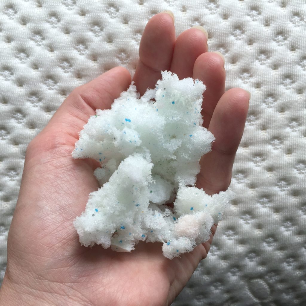 Snuggle-Pedic™ uses a proprietary mix of our very special hypo-allergenic and extremely low V.O.C. Biogreen® memory foam and CertiPUR-US® certified foam. This proprietary mix of foams come directly from our very high-end, all U.S.A. produced mattresses made right in our Westlake Village, CA factory. The very small pieces are extremely soft and fluffy and make our pillow lighter and more resilient than the usual shredded memory foam pillows found on the market. (http://www.snugglepedic.com/snuggle-pedic-bamboo-pillow.html)