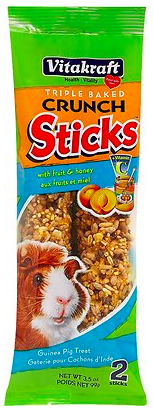 Give your Guinea Pig a wholesome treat and encourage natural foraging with Vitakraft Triple Baked Crunch Sticks with Fruit & Honey Guinea Pig Treats. Treats are a great way to bond with your pet, add variety to his diet and satisfy the need to chew. This treat stick is triple baked for a crunchiness small pets love and has a natural wood stick center for long-lasting chewing fun. It clips easily to your pet’s habitat to encourage foraging behaviors, provide mental and physical exercise and prevent boredom. (Chewy.com).