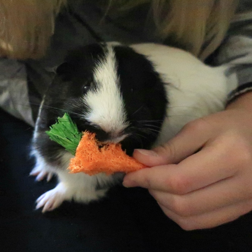 Since the bedding includes some fun treats, we shared them between the guinea pig and hamster. Nutmeg really enjoyed chewing on her carrot!