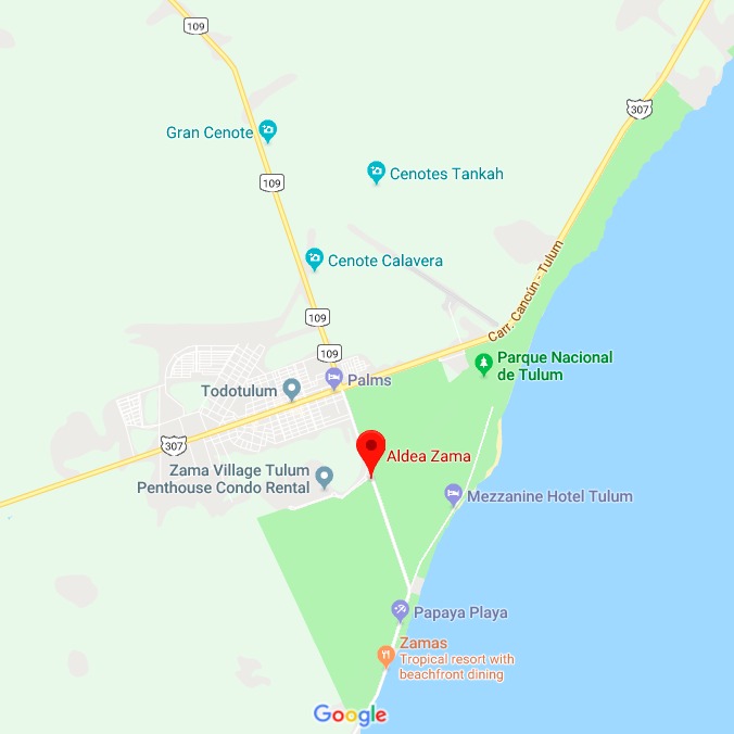 Getting there is fairly easy, and we used the directions provided plus Google Maps. You head down to Tulum (about 2 hours south of Cancun), and make a left at the main intersection on Avenue Coba. Not far up there is Pemex gas station, and then you bear right into the Aldea Zama road.