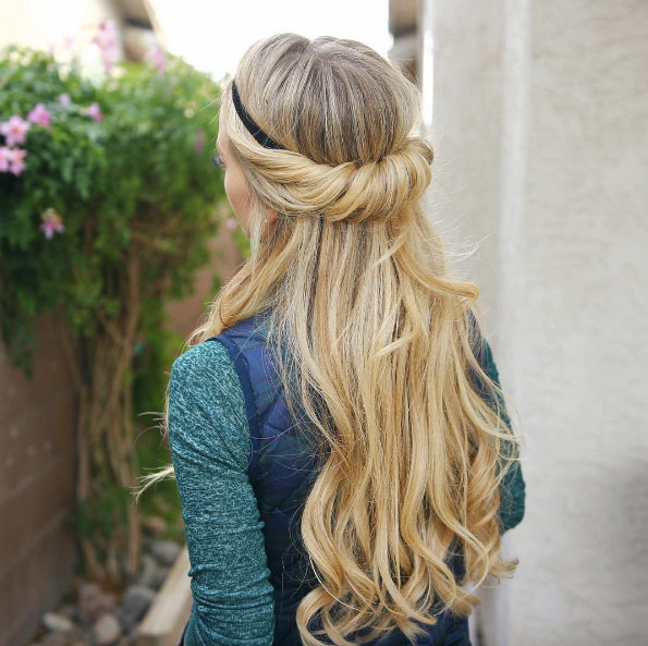 Long hair may be tough to style, but in the meantime, it looks very feminine and adds a touch of romance to your look. If you have long and wavy locks and don’t want to gather them into a bun or a ponytail, try a tuck and cover half up hairstyle.