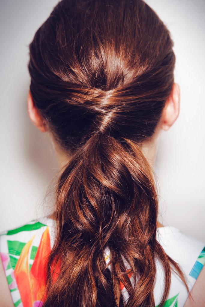 - Divide hair into two parts, then twist each part and tie them with a hair tie.