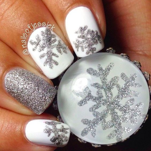 Silver glitter nail designs are traditional for New Year`s Eve, but you can add snowflakes establishments to make them feel fresh.