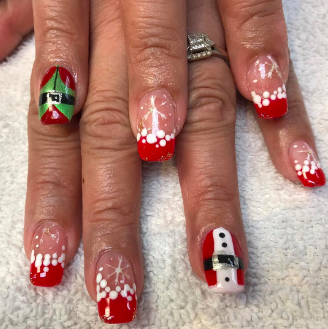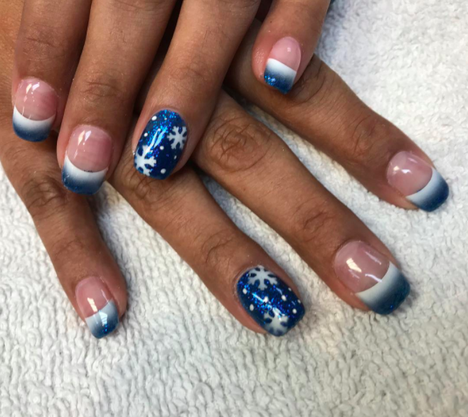Double French nails where you’ll combine white and blue colors can convey winter mood and complete your festive outfit. Snowflakes can be also added to such design to make it more frosty.