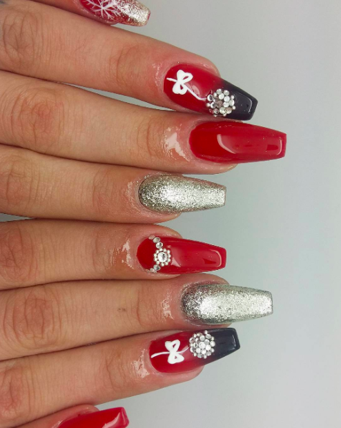 Red, black and silver glitter is a cool mixture to create a holiday atmosphere. But you can go ahead and add a jewel accent to one or two nails.