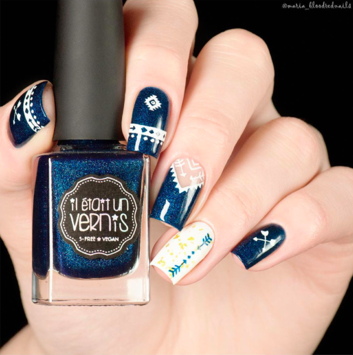 To be super chic and sophisticated you can cover your nails with ciphers. White signs and patterns on a blue base color make you look mysterious and fascinating.