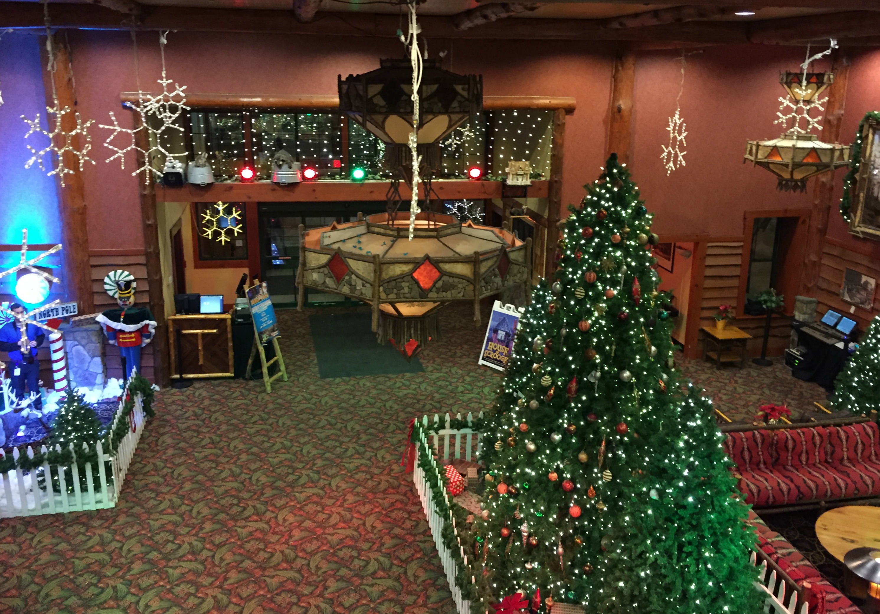 The Lodge has a very “Adirondack” type theme to it. The decor is very rustic, with a woodsy feel with lots of log and animal type designs. We went on December 22, and the Lodge was completely decked out in holiday decorations as well.