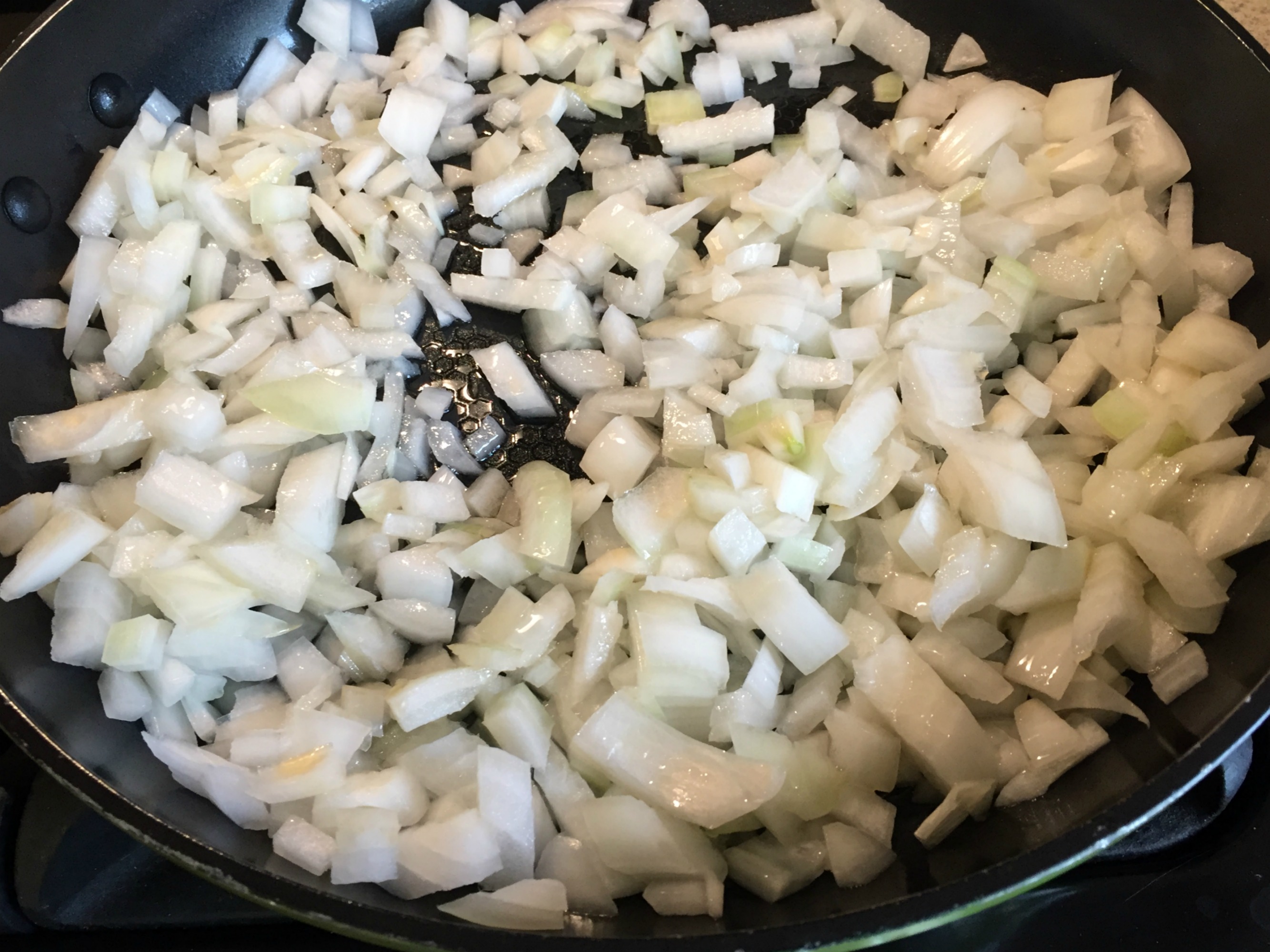 Chop the onion into small pieces. Saute in oil until they begin to turn clear.