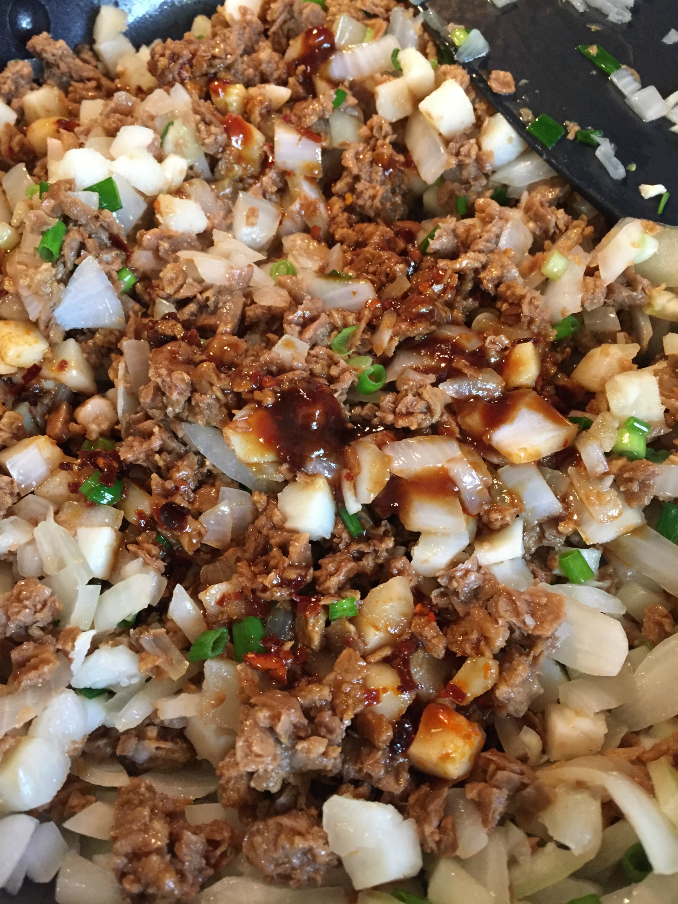 Lastly, I add the chopped water chestnuts and veggie crumbles. Sometimes I find if the water chestnuts are already chopped, I still want to cut them up a bit smaller.