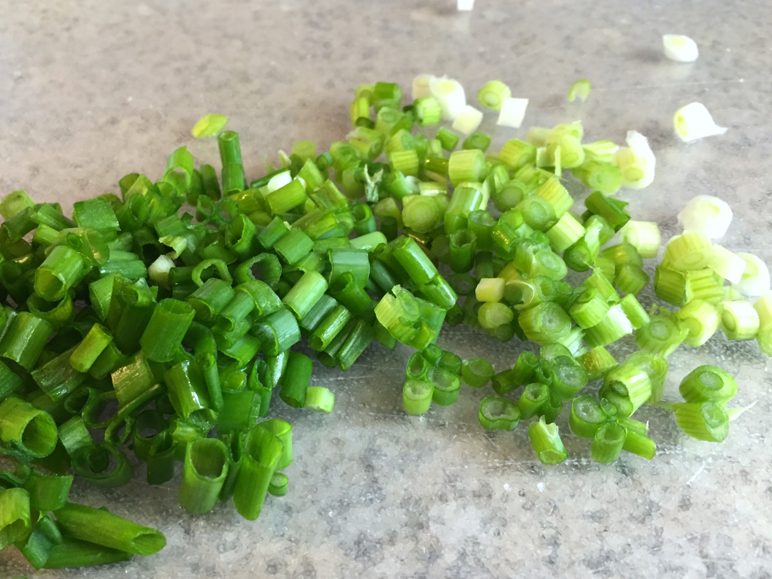 Then add in the minced garlic and sliced green onions. I drizzle in some sesame oil for added taste, but not necessary.