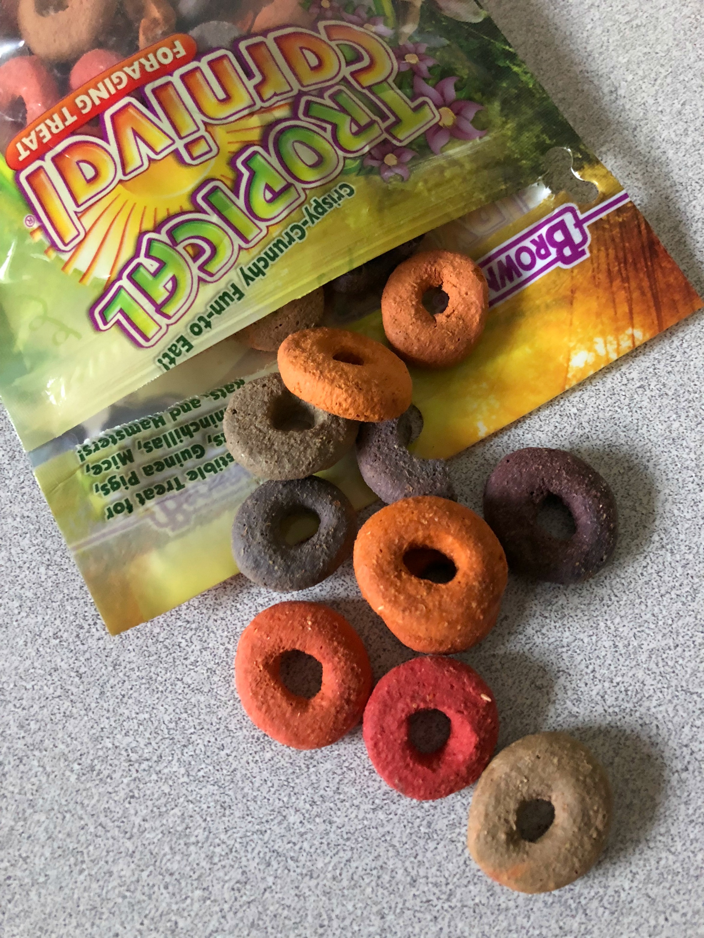 Nutmeg always greets us when we have one of the Honey O’s for her. She grabs it in her mouth and runs off with her treat!