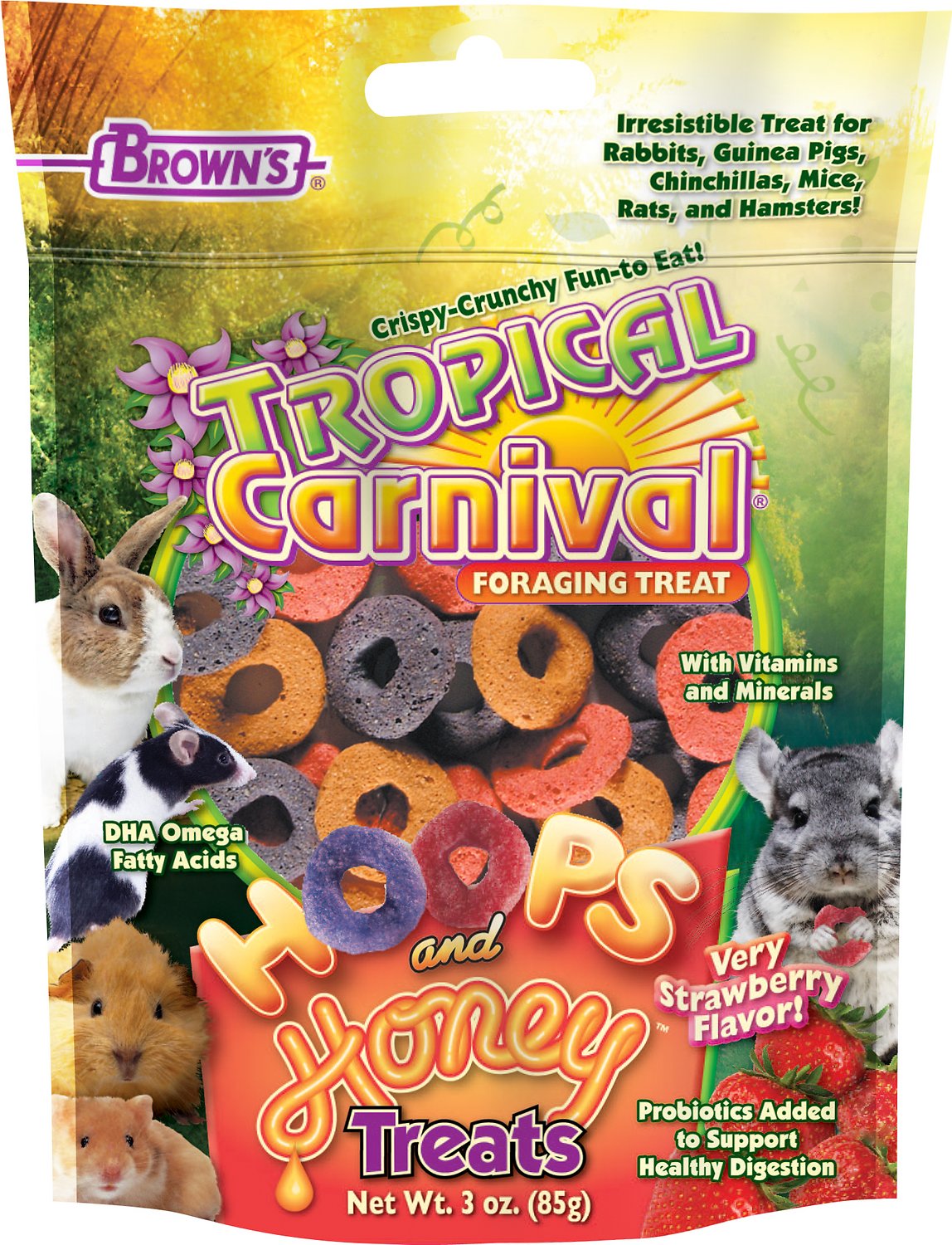 Brown’s Tropical Carnival Hoops & Honey Strawberry Flavor Small Animal Treats make great foraging and interactive treats for rabbits, guinea pigs, chinchillas, mice, rats and hamsters. These colorful hoops are fun to crunch and easy for little paws to hold as they nibble on the delicious natural flavors of honey and strawberry. Added DHA omega fatty acids and probiotics help keep coats shiny and ease the digestive tract as your pet enjoys a tasty treat. (Chewy.com)