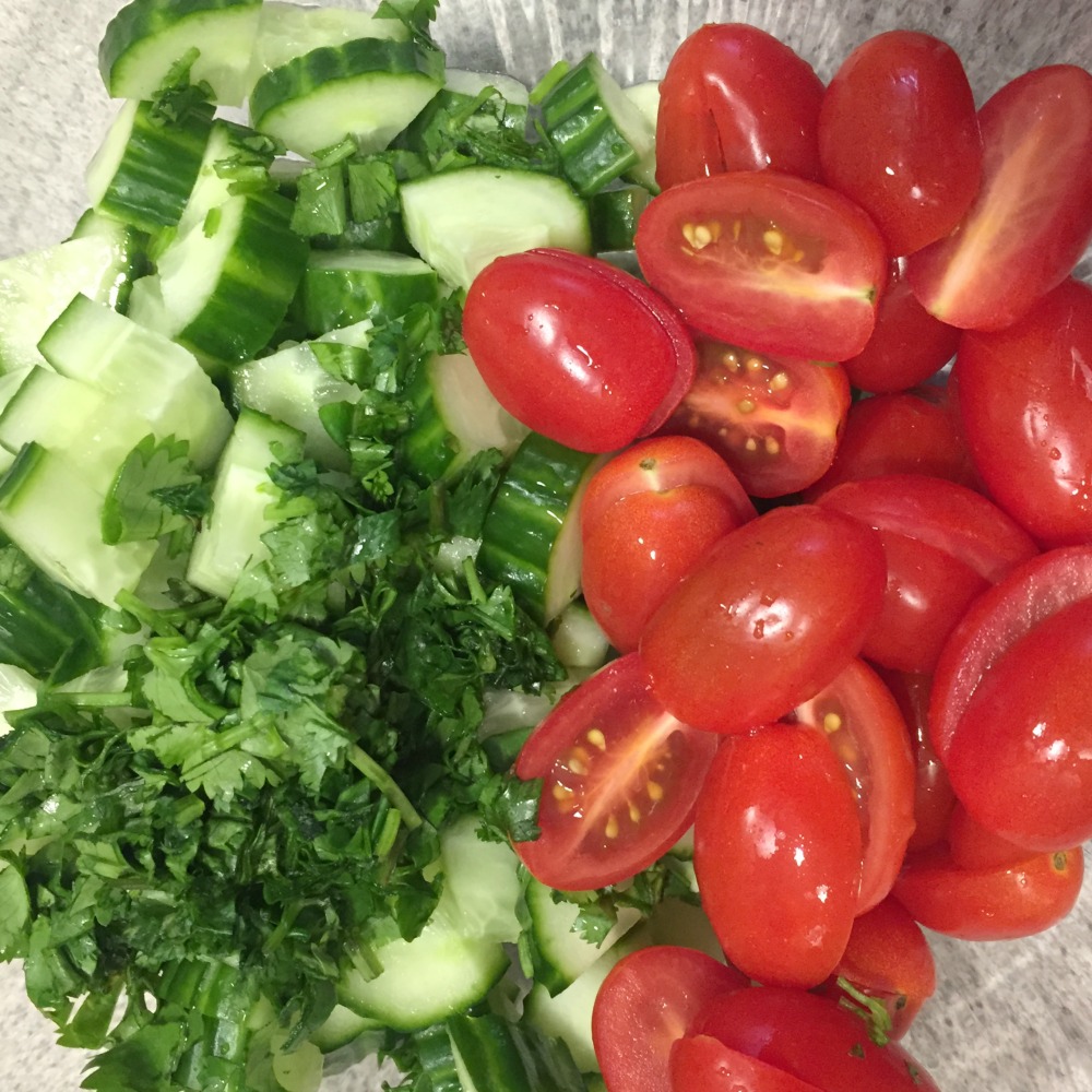 Halve the tomatoes, and chop the cucumbers into chunks. Mince a handful of fresh cilantro, and toss with the tomatoes and cucumber.