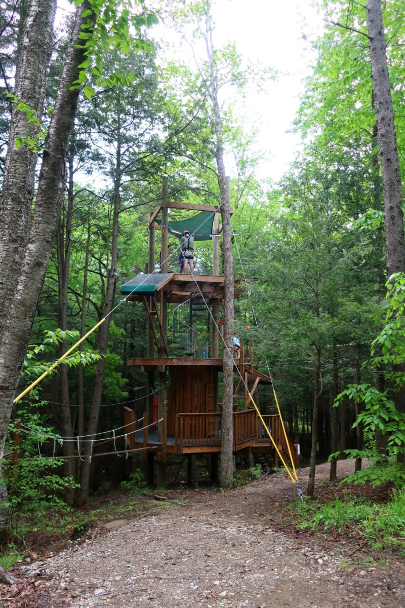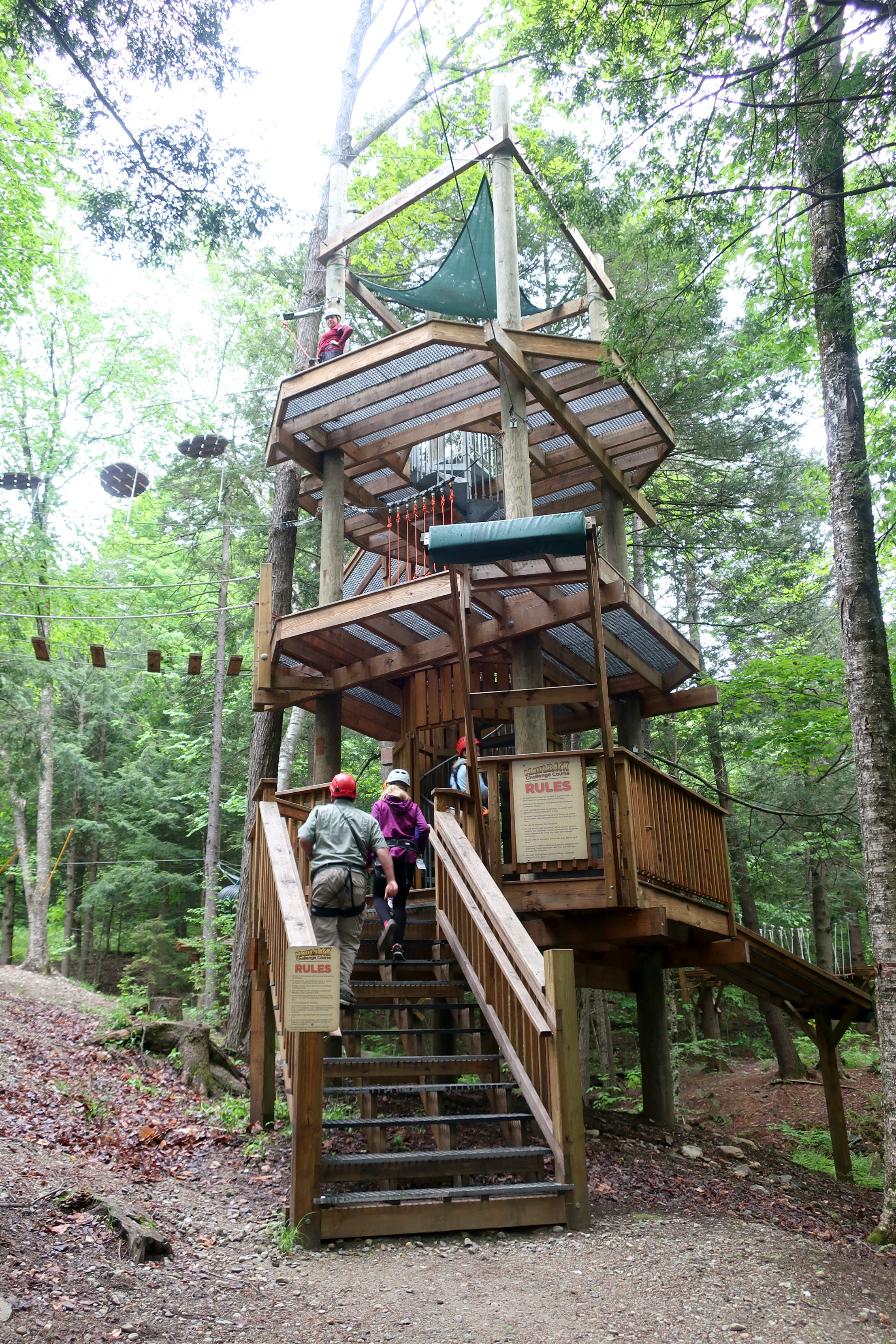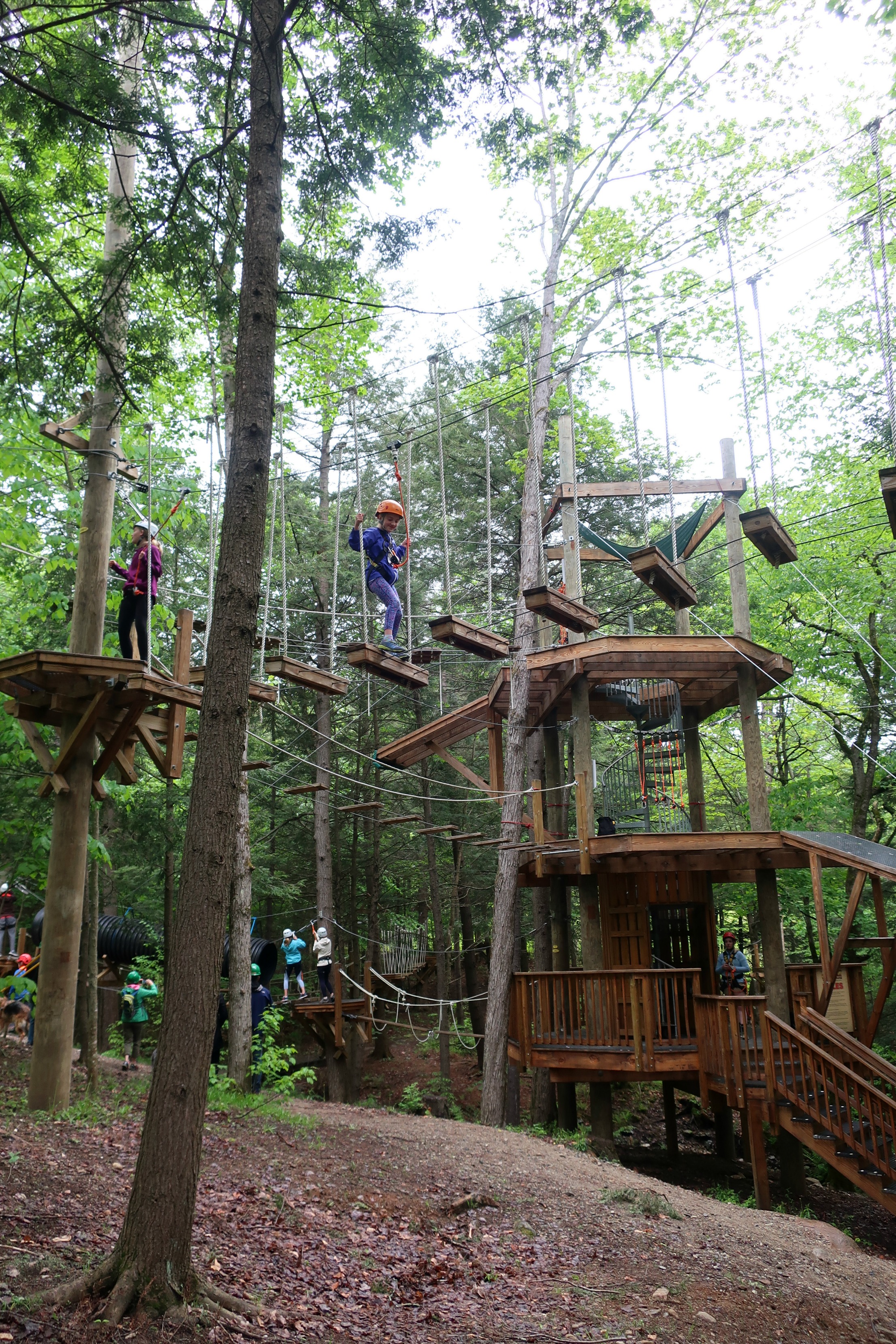The course fee includes three challenges that start at a main tower. The first level is lowest and easiest, and you work your way to the top of the tower and the third, hardest level.