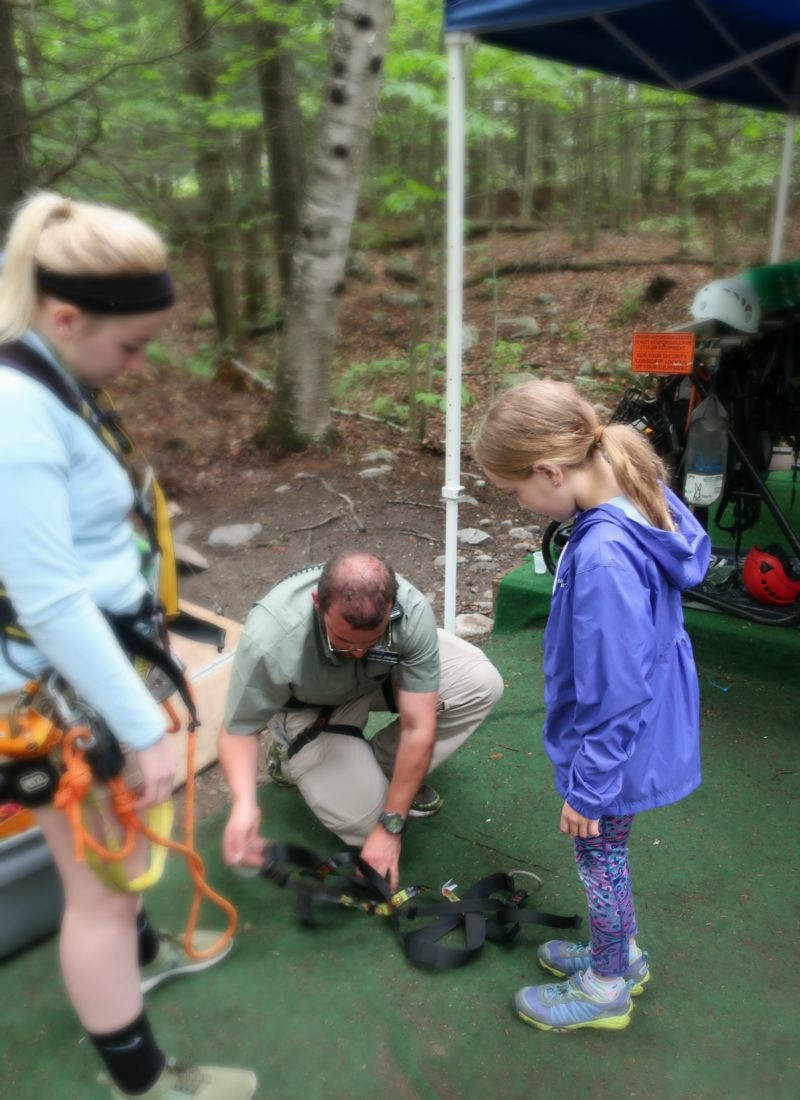 After paying, we headed back towards the course. The instructors helped the kids got their gear on, which included harnesses and helmets.