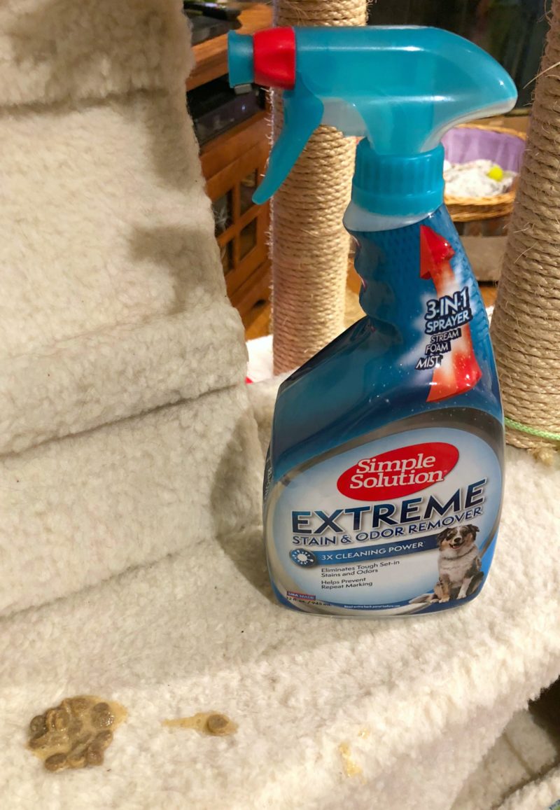 This product is basically everything I look for in a cleaner for pet messes. It tackles messes and odors, plus it is safe for the cats and my two children. Right after receiving my Simple Solution, I found some cat vomit that needed cleaning up.