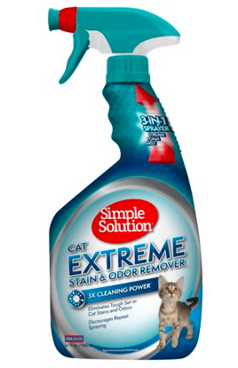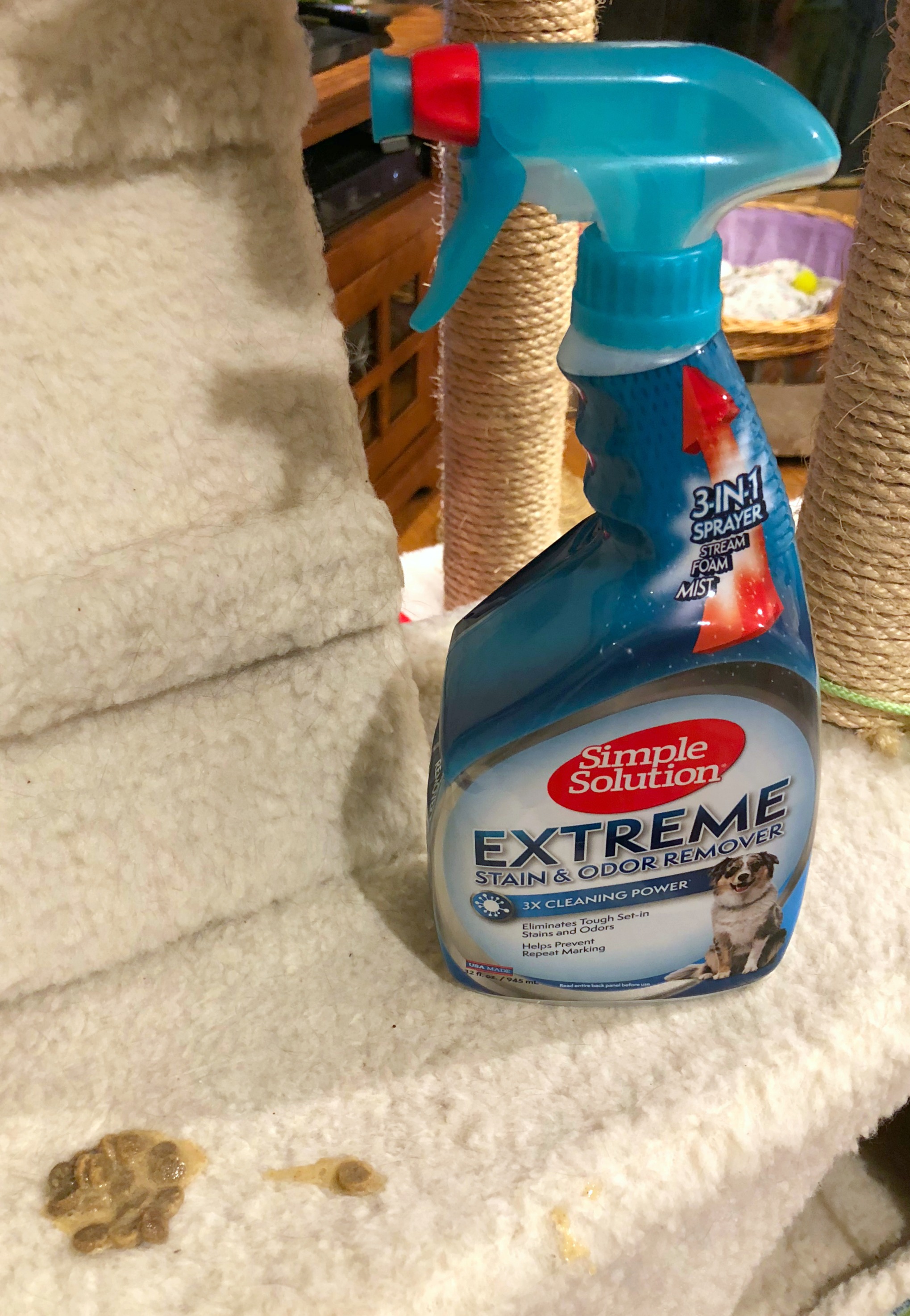 Simple Solution Extreme Stain + Odor Remover is 3x stronger* (vs. Simple Solution Stain + Odor) to eliminate tough dog stains and odors faster. Extreme Stain + Odor Remover has a professional strength formula that contains Pro-Bacteria* and enzymes that completely breaks down organic residue, permanently eliminating stains and odors, and discourages both dogs and cats from repeat marking the area. Safe to use carpet, upholstery, or other water-safe surfaces in your home to remove urine, feces, and vomit. Safe to use around children and pets when used as directed. (Chewy.com)