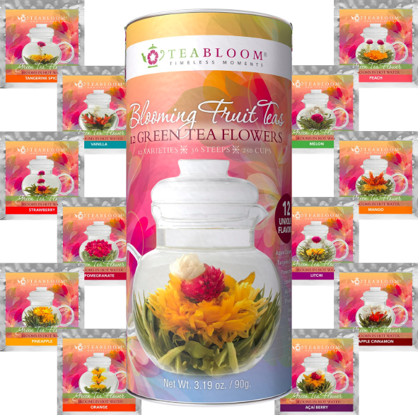 The flavors in this variety are Apple Cinnamon, Tangerine Spice, Pomegranate, Strawberry, Acai Berry, Pineapple, Orange, Mango, Vanilla, Melon, Litchi and Peach flowering teas.