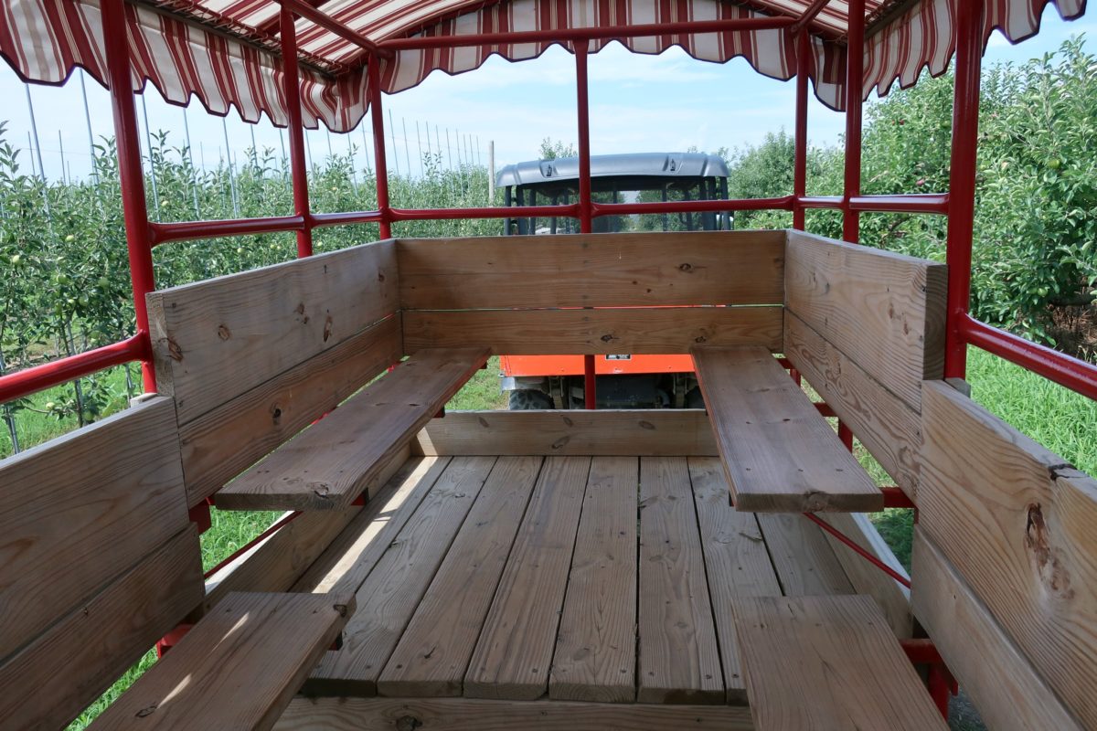 The trolley was very convenient, especially on such a hot day. It was sturdy with a gate on the back, which is nice especially for those with younger kids. The trolley was pulled by a vehicle that did not emit a diesel smell either – we have gone to many places where we are engulfed in the smell of diesel from sitting behind an old tractor. The driver dropped us off at the peaches and continued to drop others off at other stops in the orchard.