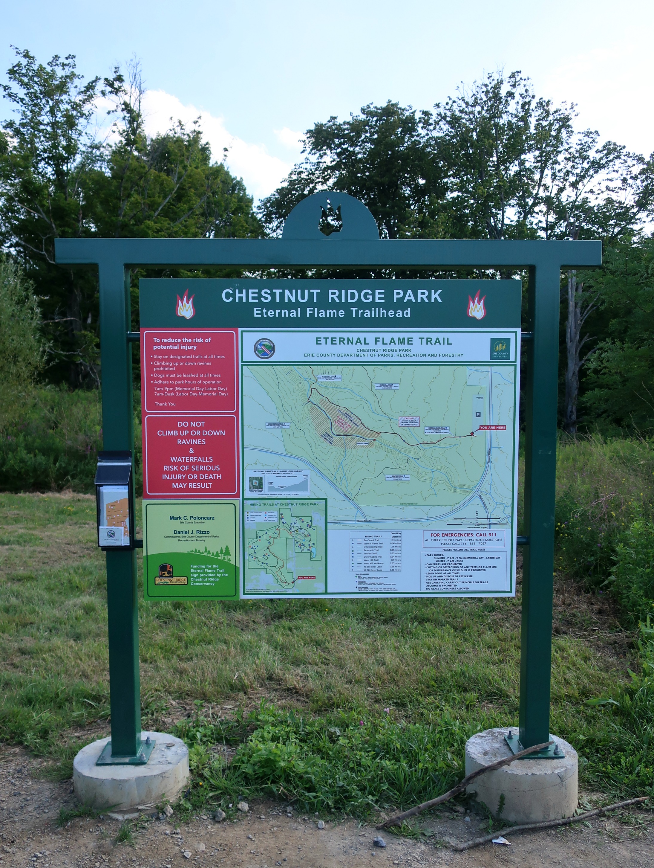 We used Google Maps to get there, heading south on Route 277. As we reached Chestnut Ridge Park, there was a big sign directing us towards the Eternal Flame 1.5 miles up the road, so we continued. The parking lot is very large and labeled as the Eternal Flame lot. We were there late in the afternoon, and considering the size of the parking lot and also the worn trail, we are pretty sure this place gets packed.