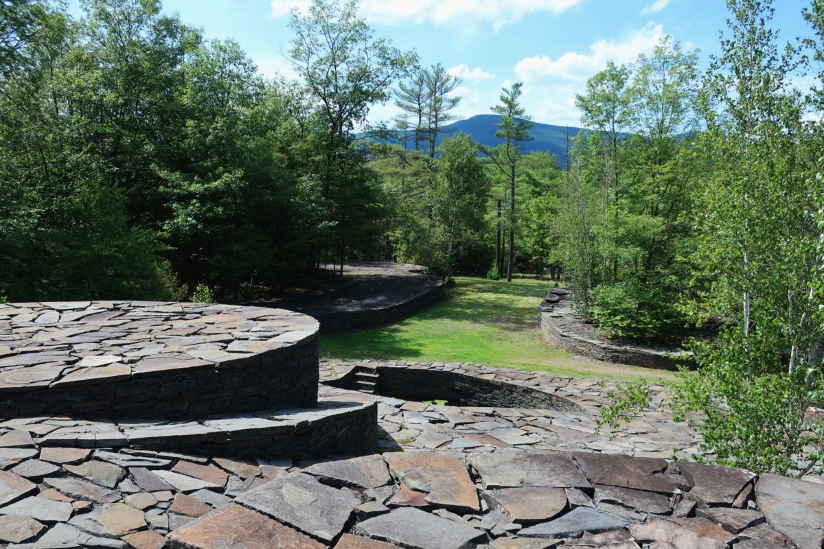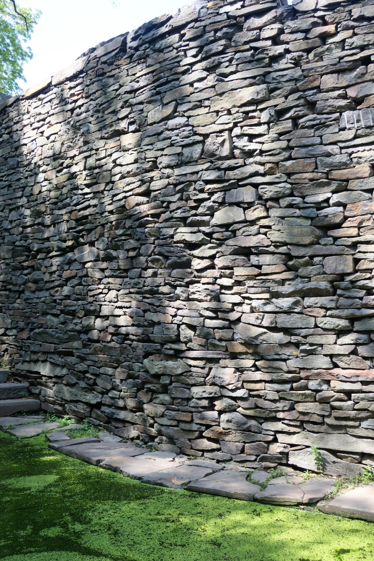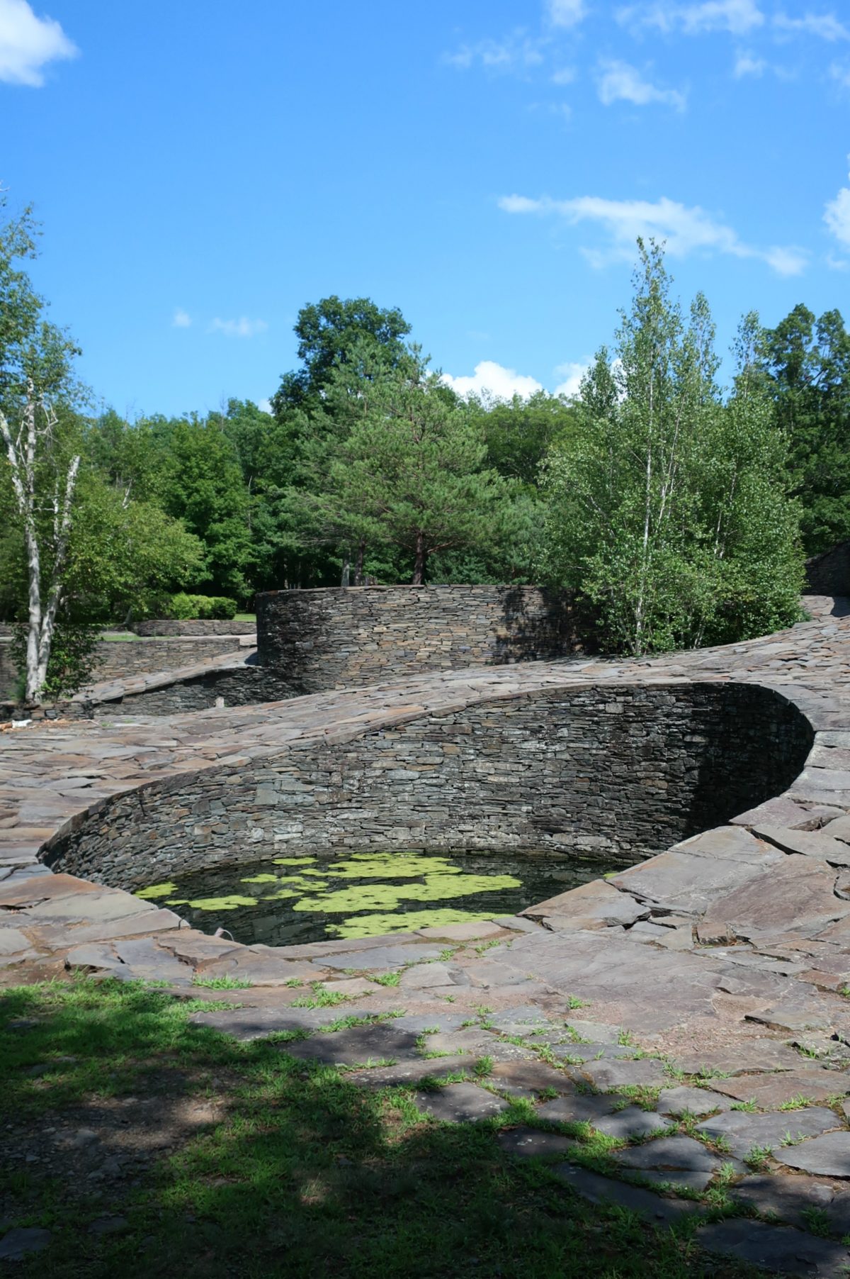 In 1938, Harvey Fite, one of the founders of the Bard College Fine Arts Department, purchased an abandoned quarry in the town of Saugerties, NY, in Ulster County, about 100 miles north of New York City. During a period of 37 years, he created the monumental world-acclaimed 6½-acre bluestone sculpture now known as Opus 40. Over time he acquired additional land (70+ acres today) and built several structures, including a beautiful large wood and stone home, a studio, garage, blacksmith shop and the Quarryman’s Museum, which houses his unique collection of indigenous tools. Constructed by this one man, using dry-key stone masonry techniques inspired by his work in restoring the Mayan civilization at Copan, refined by experiment, trial and error, Opus 40 is a labyrinthine world of finely fitted stone, swirling with ramps and terraces constructed around pools and trees and fountains, rising out of bedrock a half mile deep. (https://www.opus40.org/)