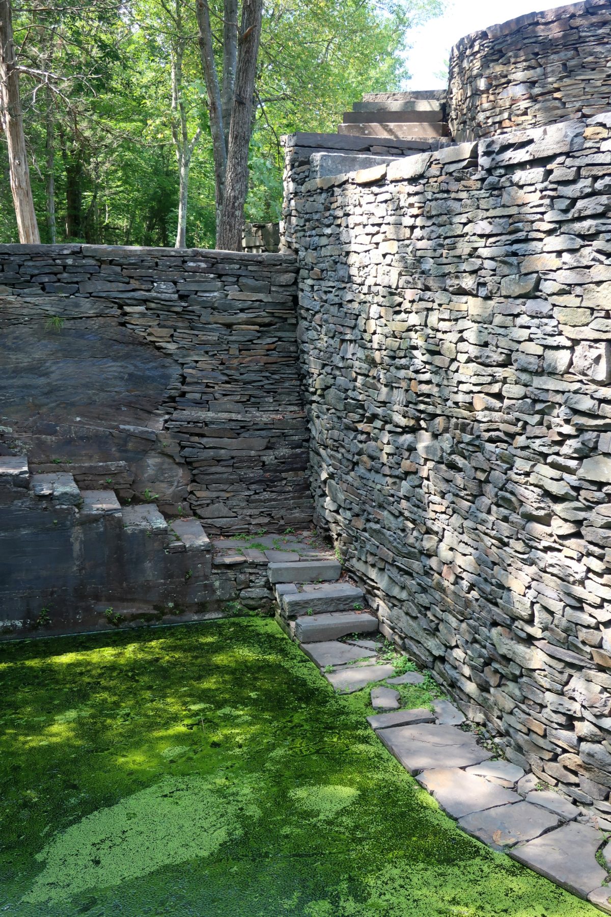 It is amazing to see all the work put into creating Opus 40, and all by one person. The curved walls and smooth lines are very impressive. There are places where water collects and there is duckweed on top, making it even more visually interesting. I love how it looks like a green carpet and almost like you could step on it.