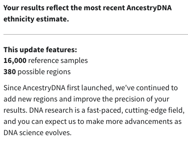 While it is a little hard to grasp why my estimates have changed so much, I see that the reference samples have increased from 3,000 to over 16,000. I have noticed my DNA matches have increased quite a bit over the years (mostly distant cousins), and it seems like AncestryDNA has grown a lot overall. A couple years ago, I didn’t know anyone who had taken an Ancestry DNA test, and now I have several friends and family members who have taken it.