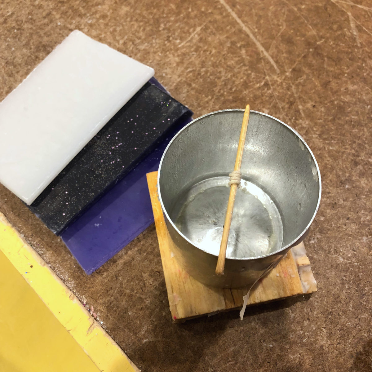 Once you have your colors picked out, you are ready to start filling your mold. You need to make sure the wick stays centered in the candle.