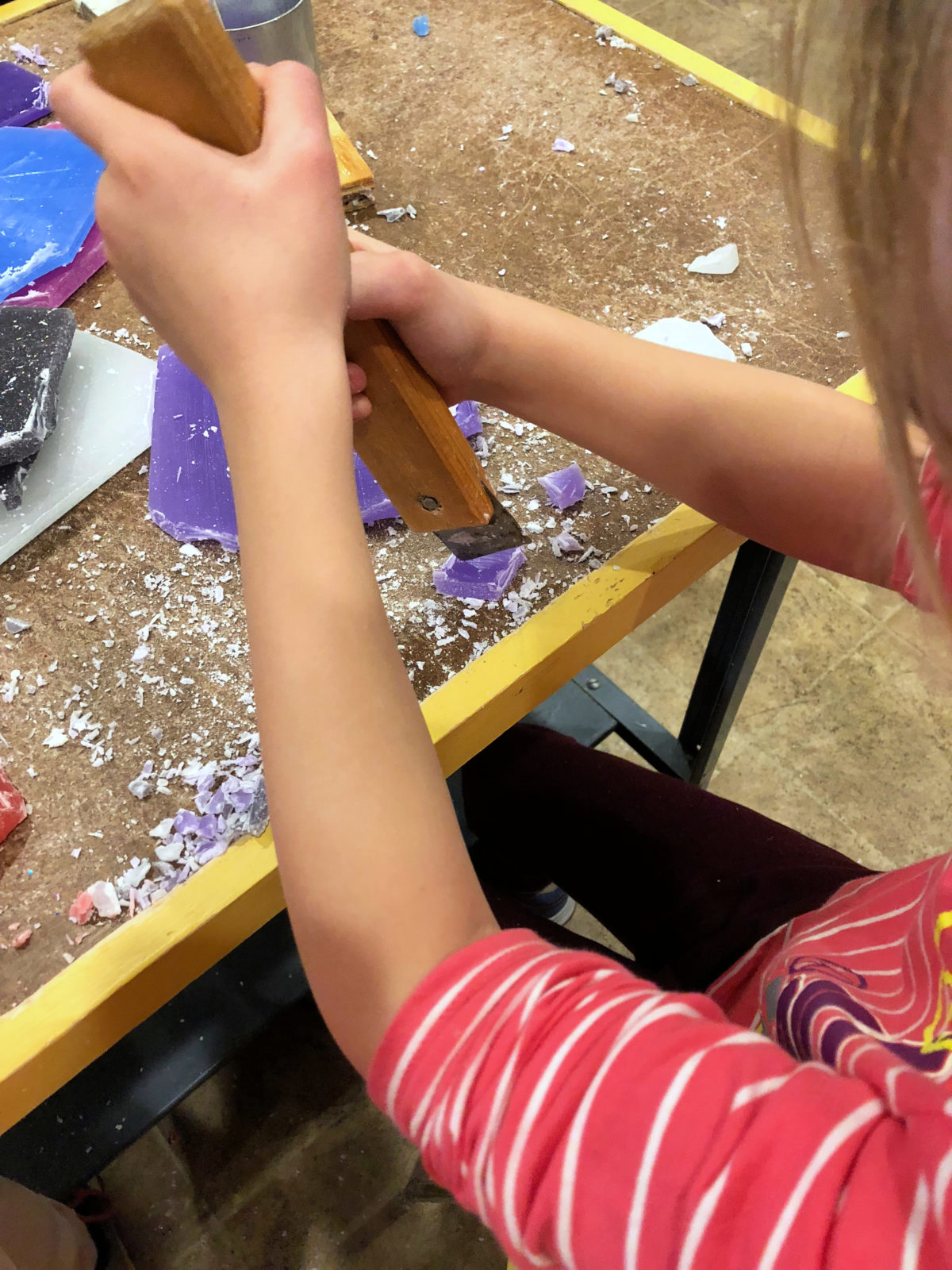 The kids used a tool to chop their wax into pieces, and then roll it in their hands to remove shavings and crumbs of wax.