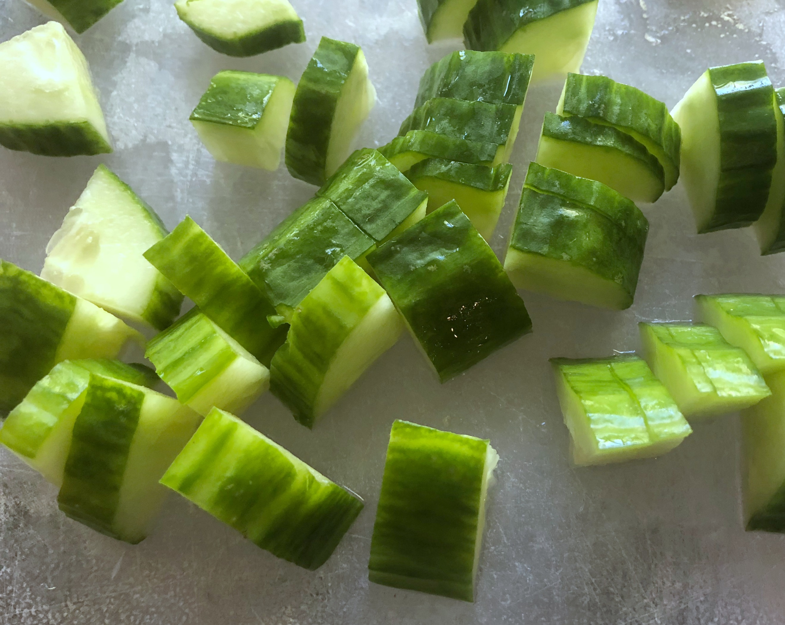 Chop 1/2 English cucumber and halve the pint of grape tomatoes.