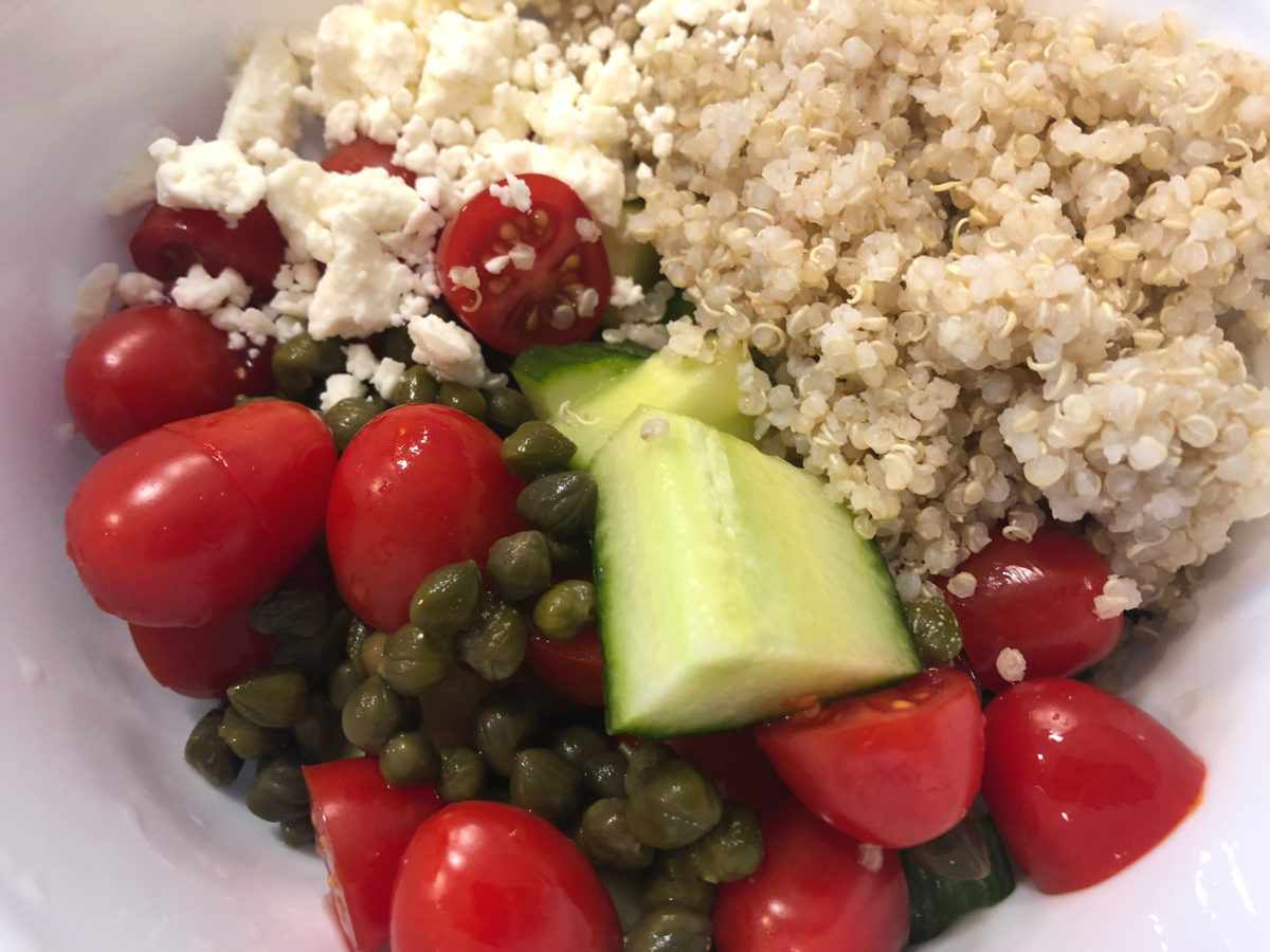 ~ quinoa (I love organic tri-color quinoa) ~ English cucumber ~ Grape or cherry tomatoes (pint) ~ Feta cheese ~ Capers ~ Olive oil and salt
