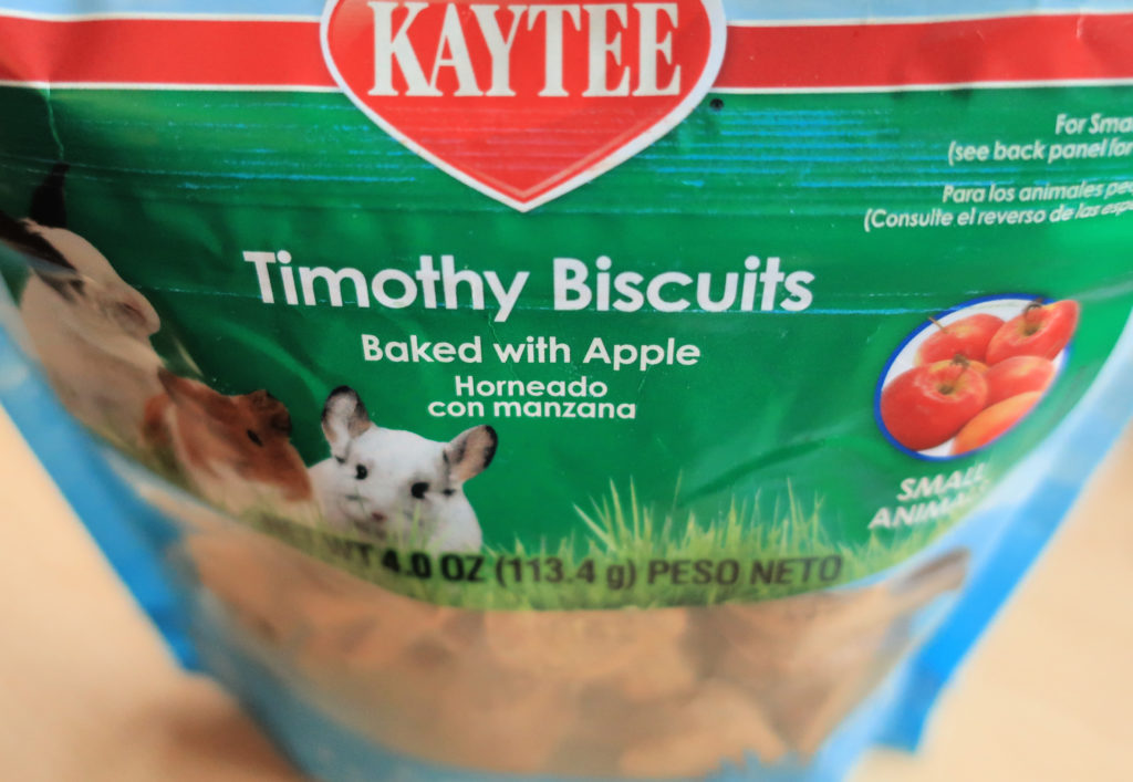 “Give your pet the benefits of high-fiber timothy hay in a baked, easy-to-feed biscuit with Kaytee Baked Apple Timothy Biscuit Small Animal Treats. Small pets including Guinea Pigs, rabbits and chinchillas need hay to aid in the digestion process, keep their teeth trim and satisfy their need to chew. In fact, hay should make up 75 percent of their daily diet. Kaytee Baked Apple Timothy Biscuit Small Animal Treats are crunchy sun-cured timothy hay treats baked with delicious apples and other ingredients like what, flaxseed, alfalfa meal and dried cane molasses. They provide a more challenging chew than regular bale hay and make a great supplement to your small pet’s regular hay supply. Offer one biscuit a few times a day by hand or to your pet’s food bowl.” (Chewy.com)