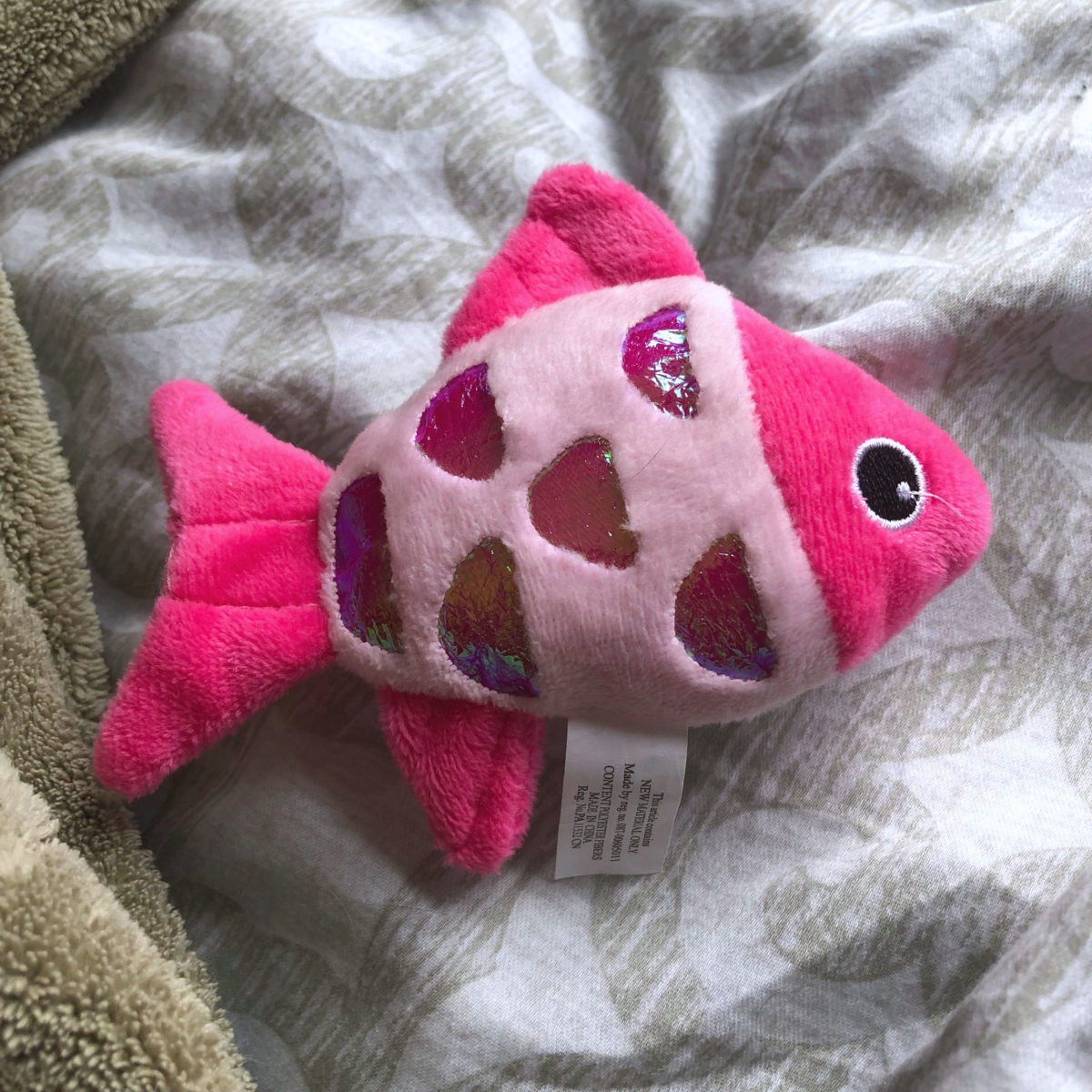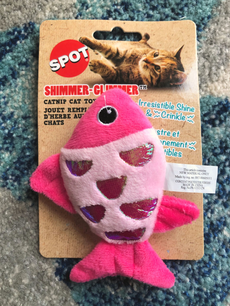 This Shimmer Glimmer fish is bright and cute, and has just the right balance of shine and crinkly material. It also has catnip to help entice your cat to play with it.