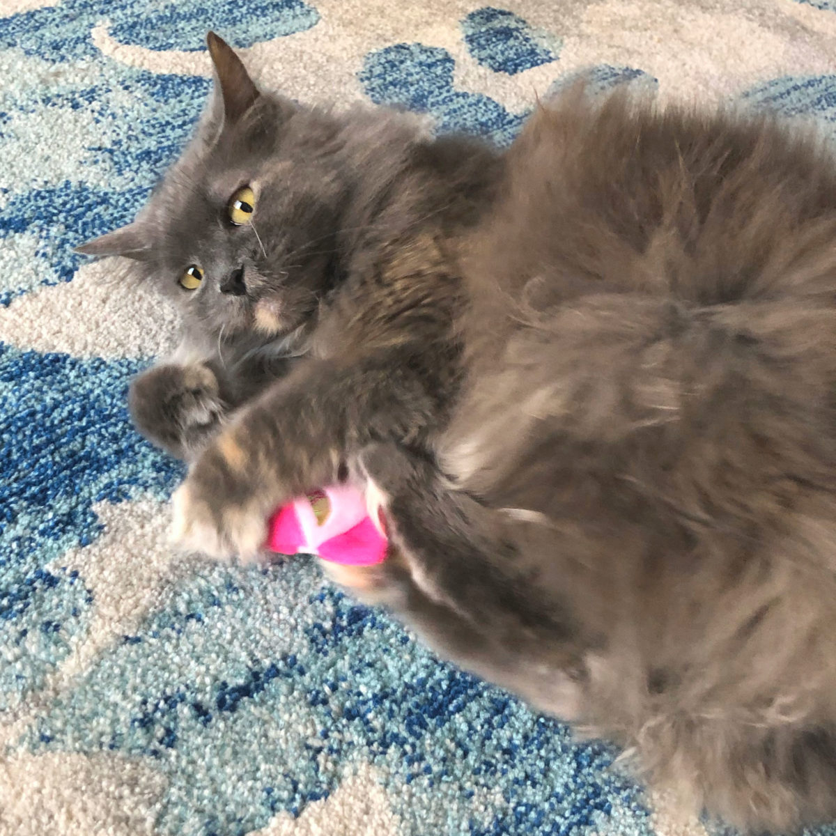 Jenny usually carries her toys around the house, making “honking” noises. If you aren’t familiar with our adventures in rescuing these two cats, we were told that this cat had an odd “meow”, and she definitely does. Sometimes all you hear is a raspy sound, but when Jenny carries around a toy in her mouth, the best way to describe it is she squawks like a goose! Here’s Jenny with her catch of the day!