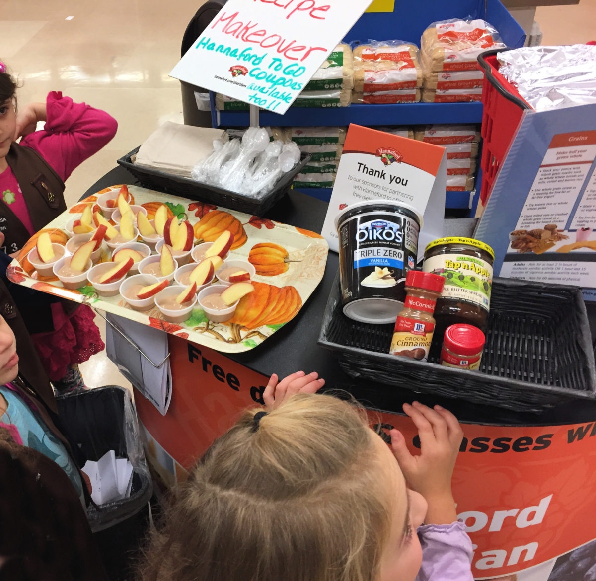 The kids got to sample a healthy recipe as well. Our Hannaford Dietician regularly does some neat sampling stations, and the girls enjoyed their treat of apples with a cinnamon-yogurt dip.