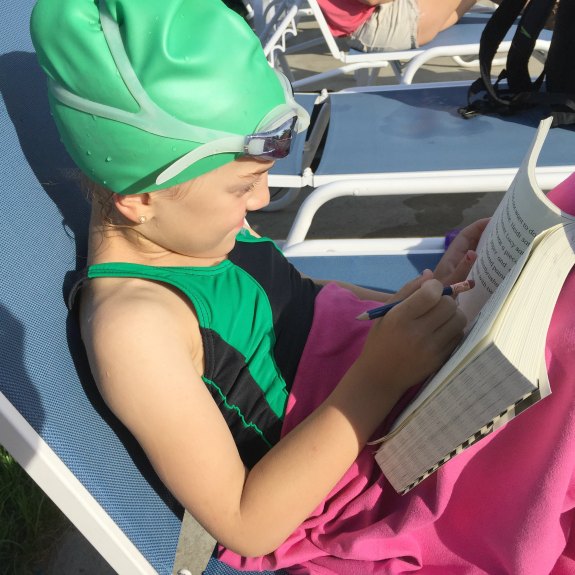 In the summer, I encourage the kids to bring books wherever they go. This is my daughter reading at a swim meet, and it is fun to read outdoors, while camping, in the woods, and so on.