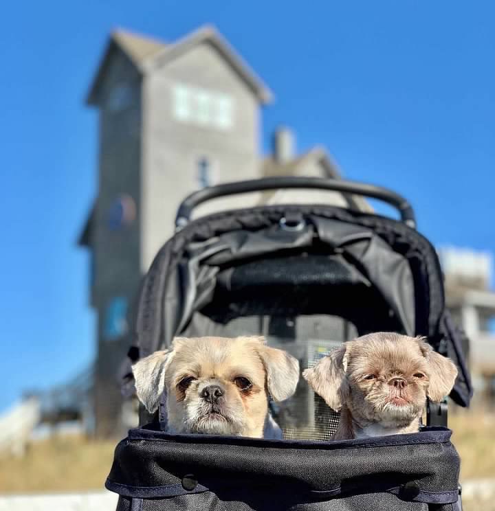 Our dogs are quite small, so we often use a dog stroller to transport them.