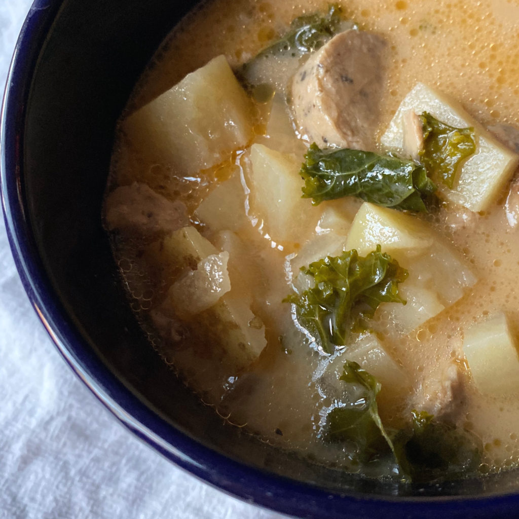 My husband has enjoyed zuppa toscana at Olive Garden for years, so we decided to make this kinds of at home. Since I am a vegetarian (and had never actually had the soup before!), we made some substitutions. We subbed in vegetarian sausages, which every meat-lover agrees is delicious! This soup is always a hit and we enjoy the leftovers too.
