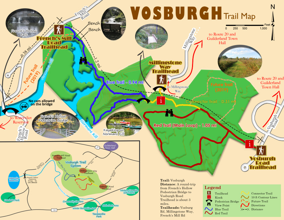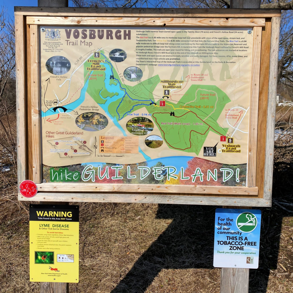“Vosburgh Trails is the new hiking system that traverses 124 acres of Town-owned open space. The trails provide an easy loop (2.1 miles) through grasslands with a shortcut to a vista view. The loop trail also connects to a spur which continues along a wooded crest to the Watervliet Reservoir and popular pedestrian bridge over the Normanskill Creek. A roundtrip from Vosburgh Road trailhead to the Reservoir is about 3 miles. Trailheads are located on Vosburgh Drive, at the end of the sidewalk on Millingstone Way, and at French’s Mill Road.”