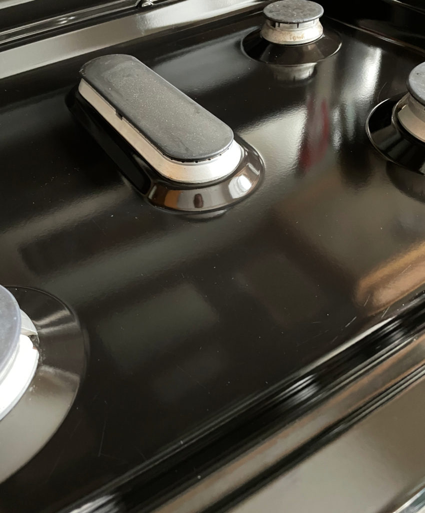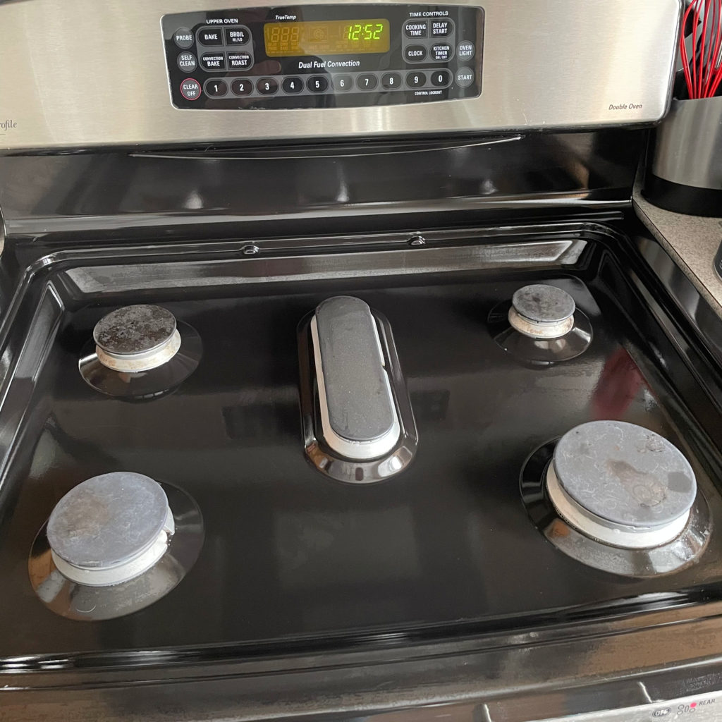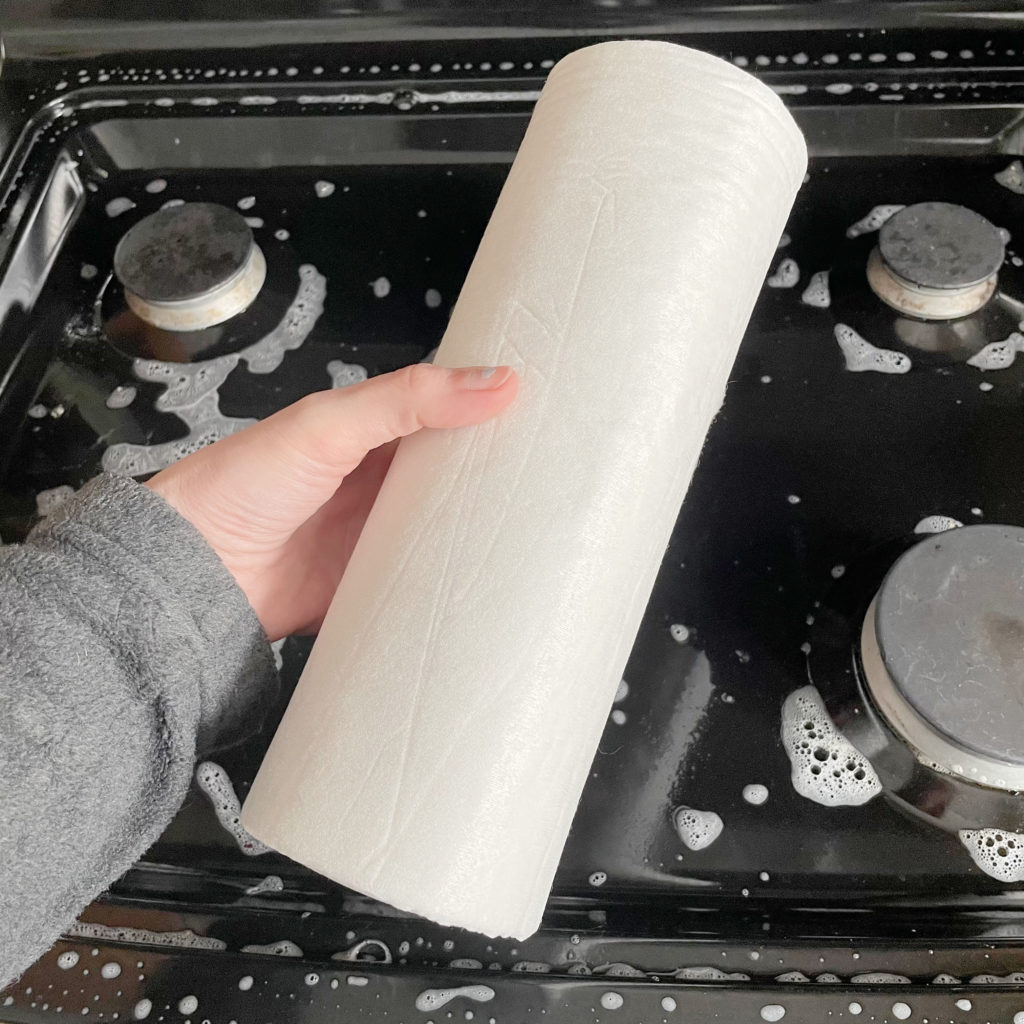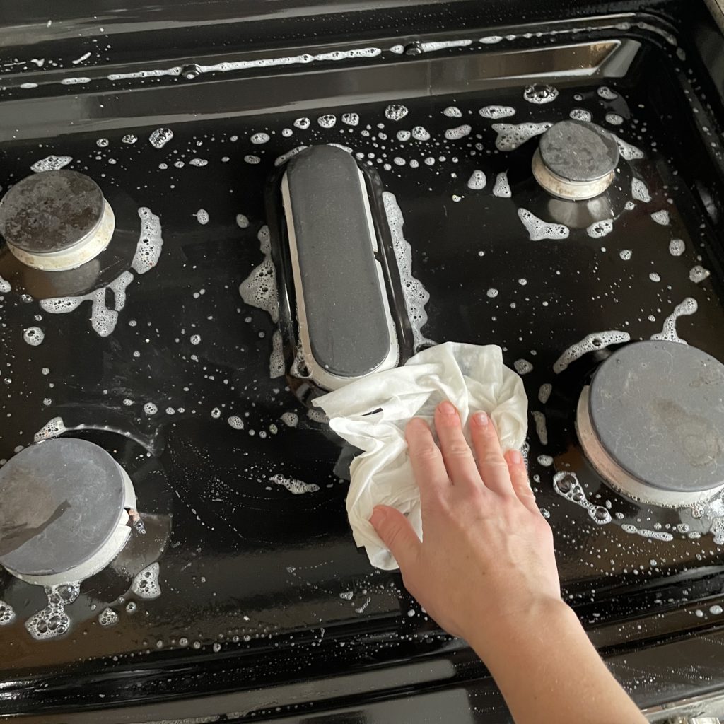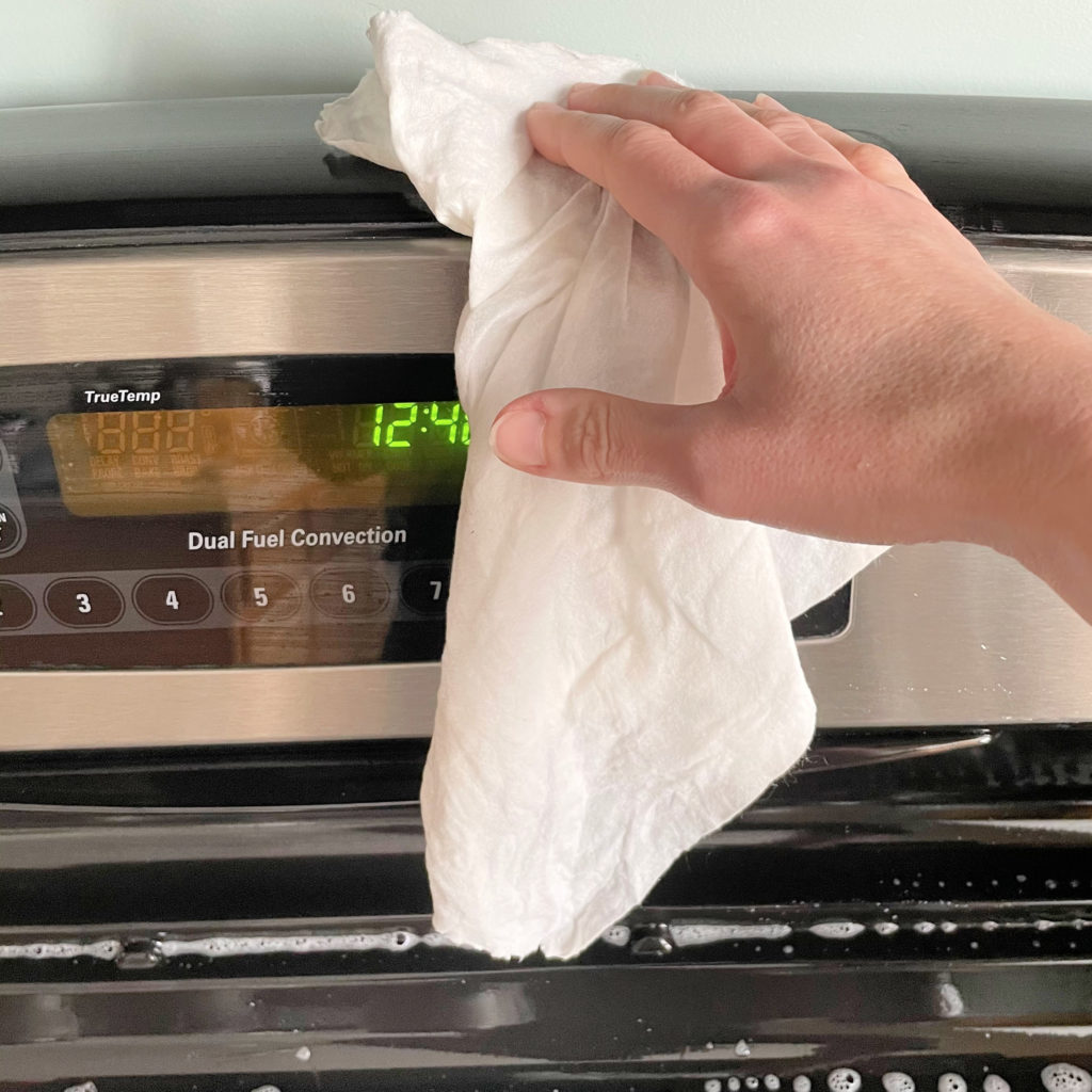 The bamboo towels are absorbent, so I kept going over the surface to remove soapy water, crumbs, grease, etc., rinsing the towel and then wiping the stovetop.