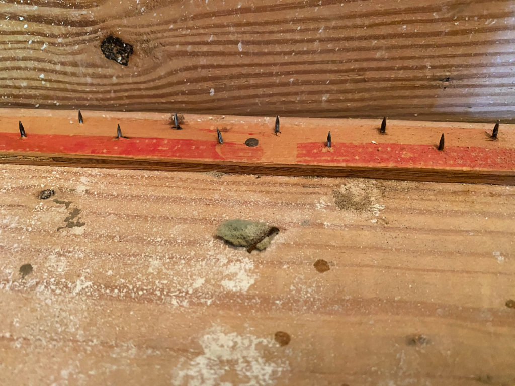 Next, I made sure I had removed all the carpet strips, and used needle nose pliers to remove all the carpet staples. (You can also see a rusty staple in this photo, that had to be removed as well).