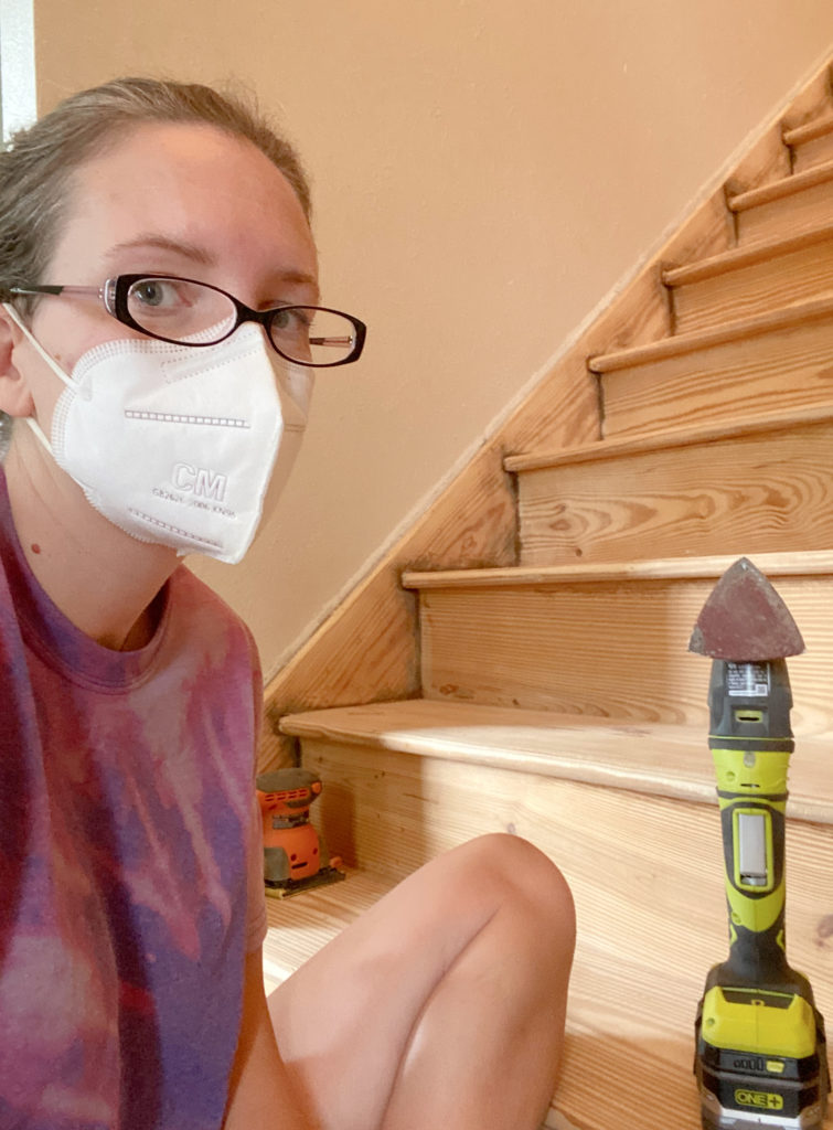 I sanded everything here – the stringers, the stairs, and the risers. I wore a mask so as not to breathe in all the dirt and dust, or the old stain.
