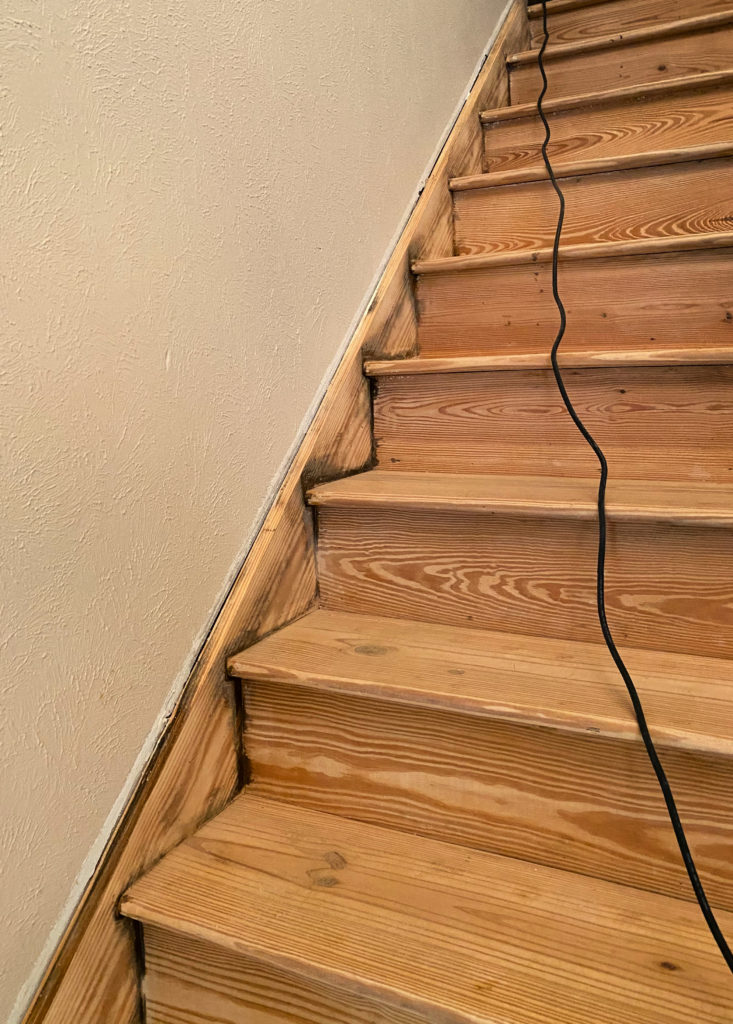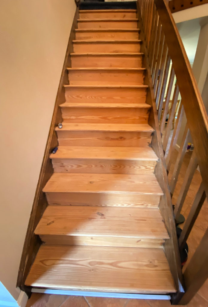 Now, my original plan was to refinish the stairs with a coat of polyurethane. However, once I pulled up the carpet, we were disappointed to see pine. The more we worked on the stairs, the more we realized it was a very cheap pine, with lots of damages – holes, cracks, construction marks, even nails and screws driven through the wood.