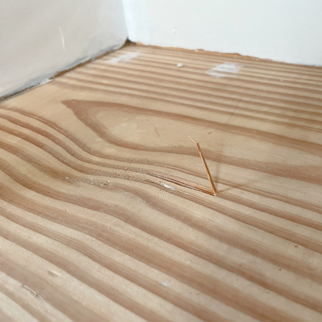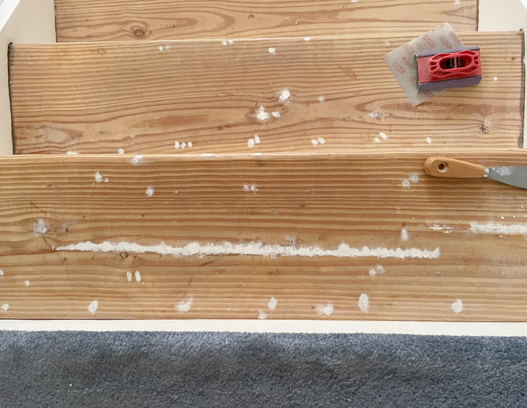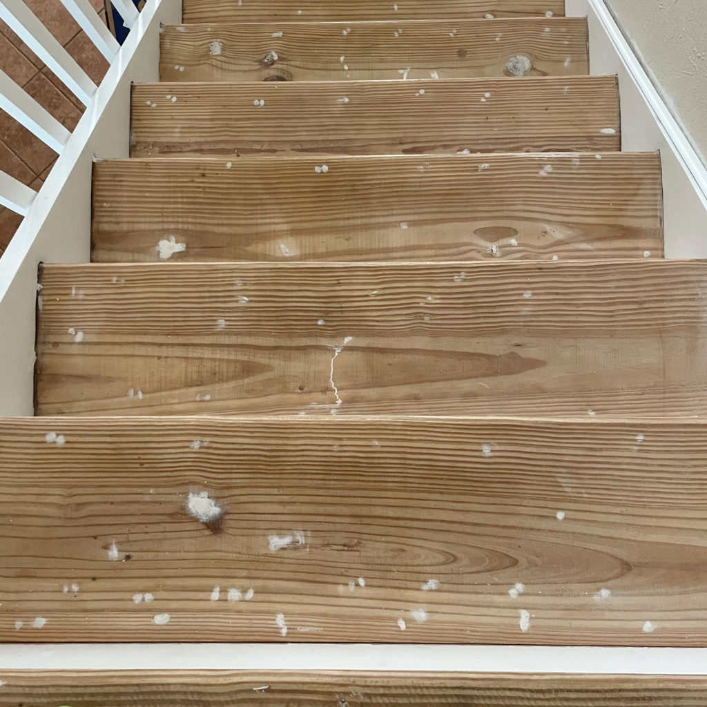 As you can see, I ended up using a lot of wood filler. I would say I used most of the 6oz tube. This really was a tedious job, as you can see I ended up filling quite a few spots, including all of the spots where the carpet was stapled on.