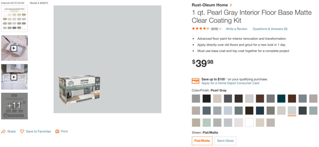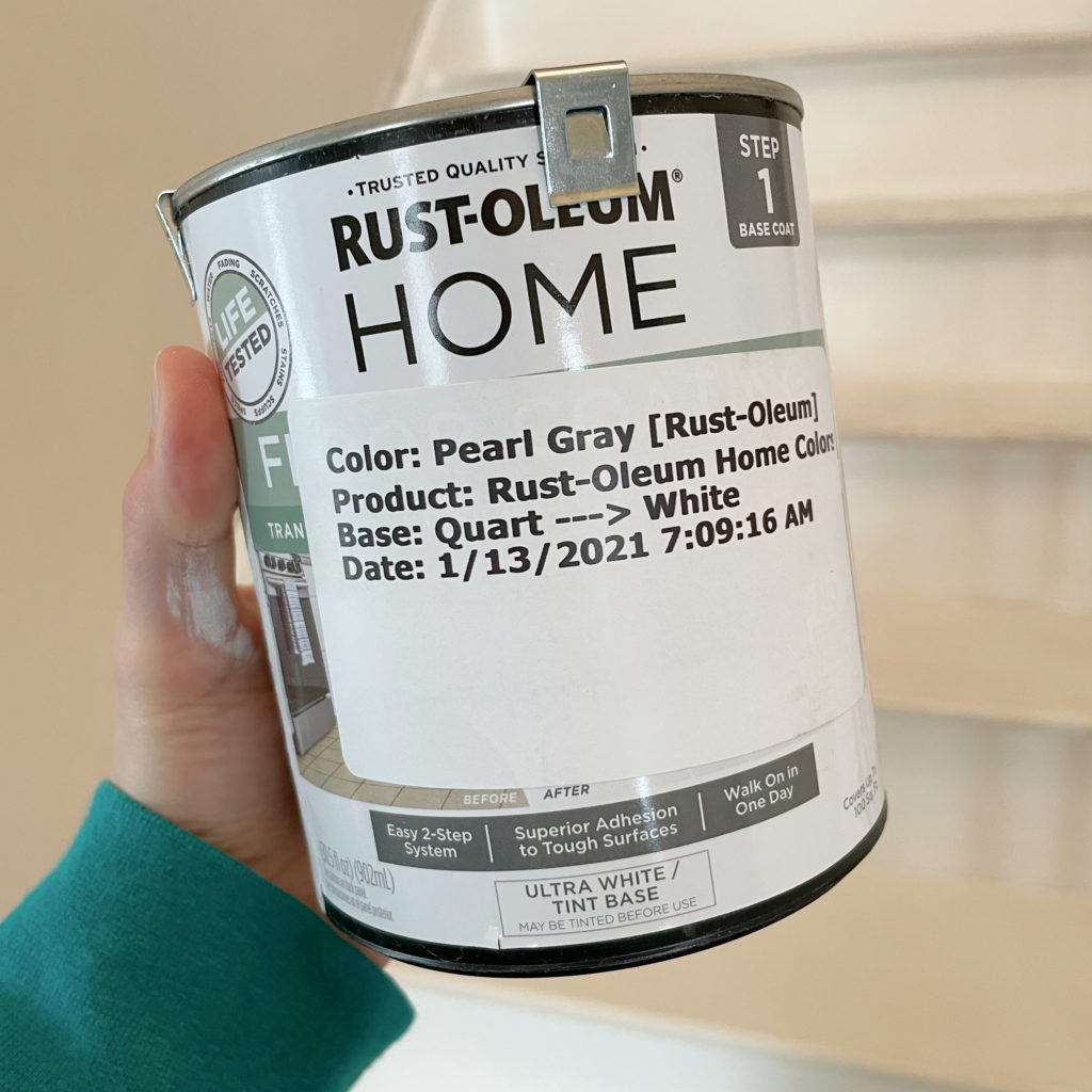For the paint, I ordered a floor paint kit from Home Depot, but you can also get this Rust-Oleum Floor Coating on Amazon. (This post is *not* sponsored). There are a lot of great shades to pick from. I had to order this online and it took about 10 days to arrive, so my project was on hold for a little bit. When I purchased this, it was not available in the store. The kit cost $40 for two 1 quart containers (and a floor cleaner). The only alternative was to buy a full gallon of each, in store, for $40 each, so for me, it was worth the wait.