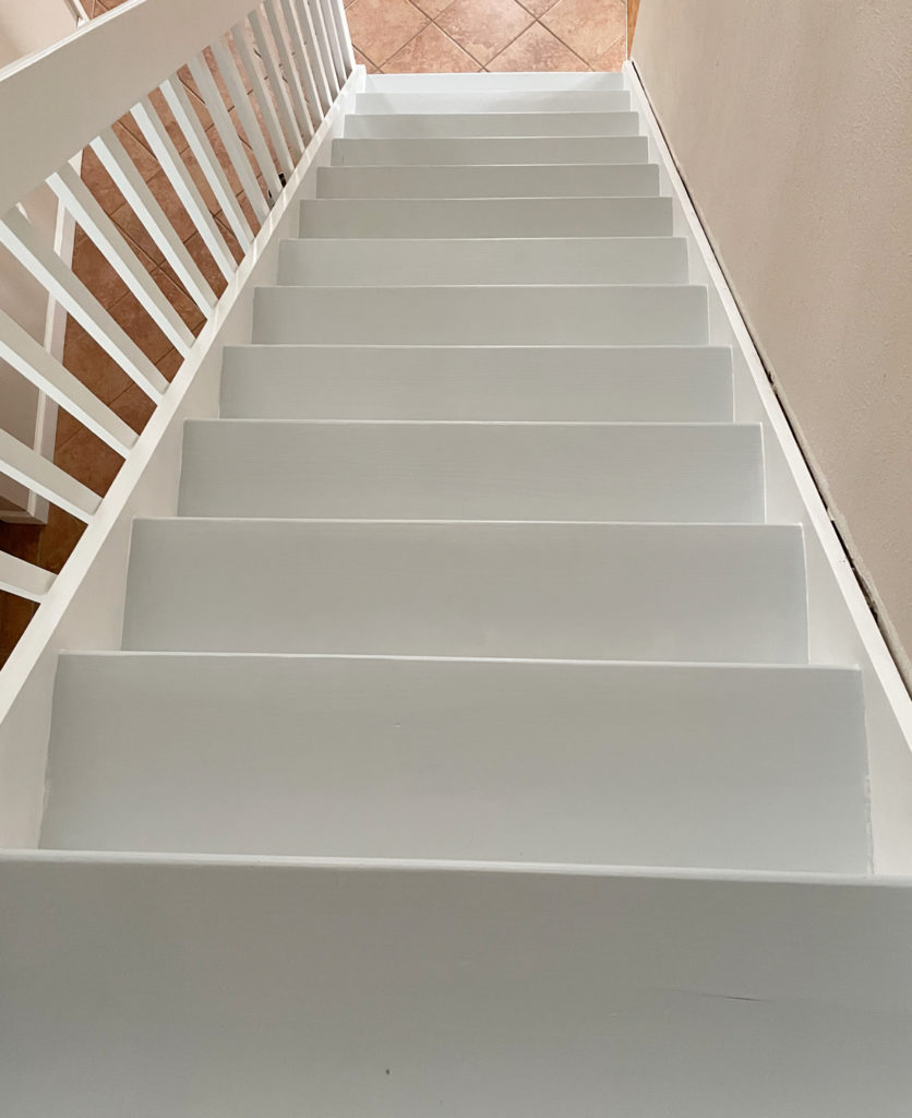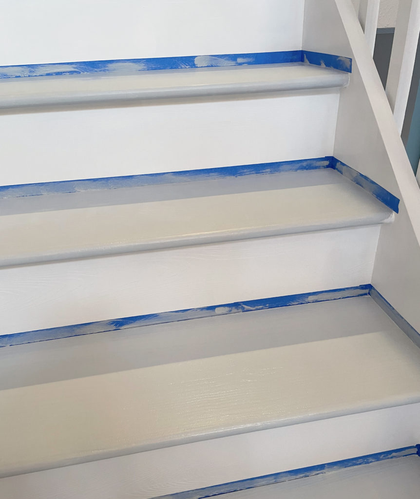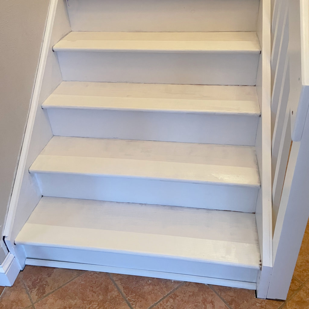I let the two coats of paint dry for a couple of days. While it says 6 hours is sufficient, I had to time it so that there would not be foot traffic on the stairs, plus I had some other commitments. The downside to this is that the kids did track some dirt on to the stairs, so I ended up carefully vacuuming and wiping down the stairs before the final topcoat.